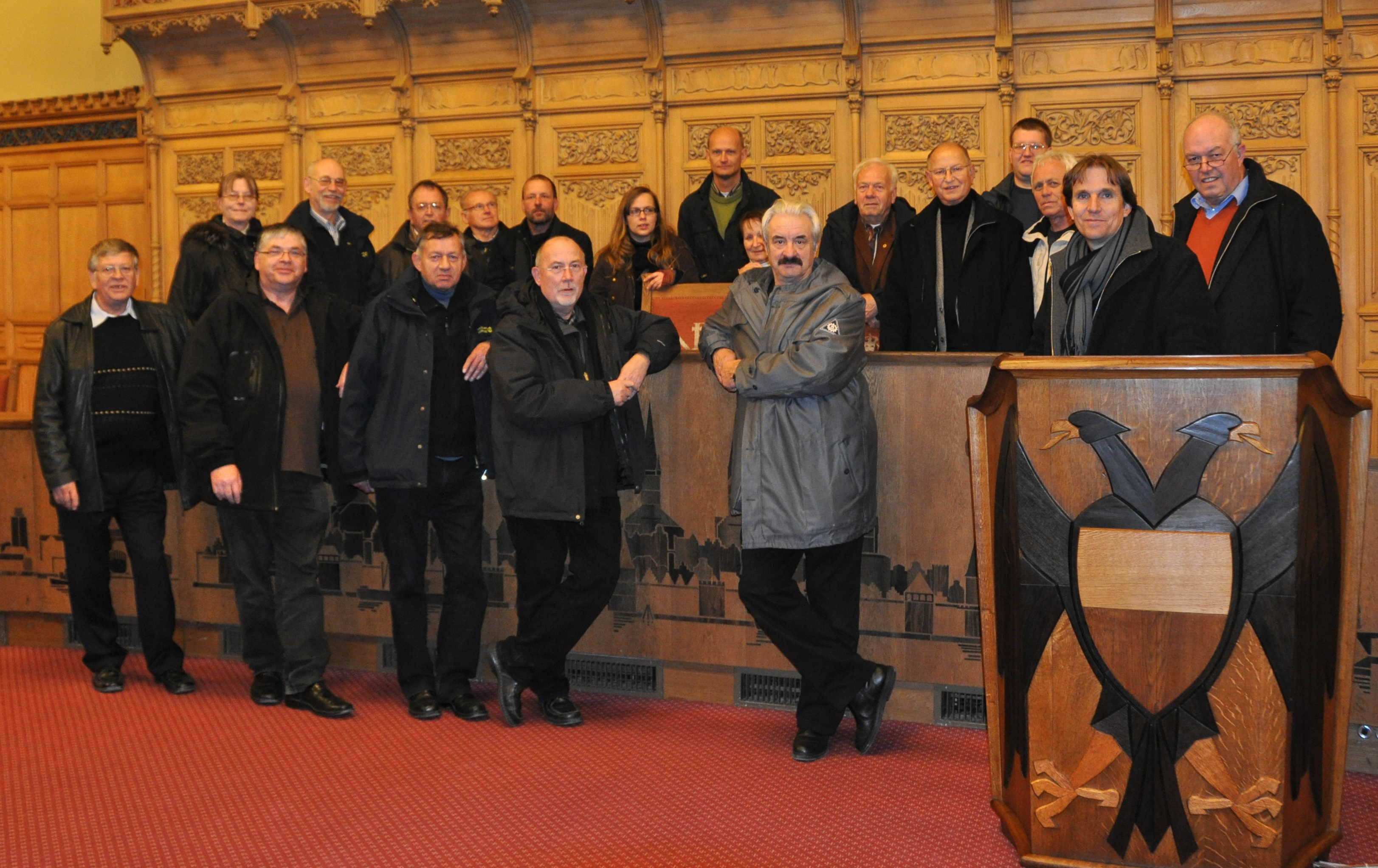 Anschließend folgte eine Führung durch das Rathaus der Stadt Lübeck. Die Teilnehmer erfuhren über die geschichtliche Einbindung der Hanse, die Baugeschichte der Kirchen in Lübeck und den Wiederaufbau der zerstörten Stadt. Eine Sonderführung durch die Stadt mit dem ehemaligen Kirchenbauhüttenpolier und THW-Helfer Heinz Walzem rundete den Besuchs der Stadt ab.