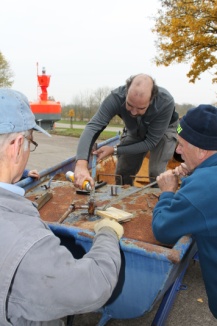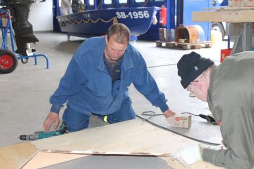 Gleich darauf wurden erste Schleif-, Spachtel-, Grundierungs-,und Lackierarbeiten von den Mitgliedern der THWhs durchgeführt. Umfangreiche Holzarbeiten waren nötig um eine Unterbaukonstruktion für das große BGS Schlauchboot zu erstellen.