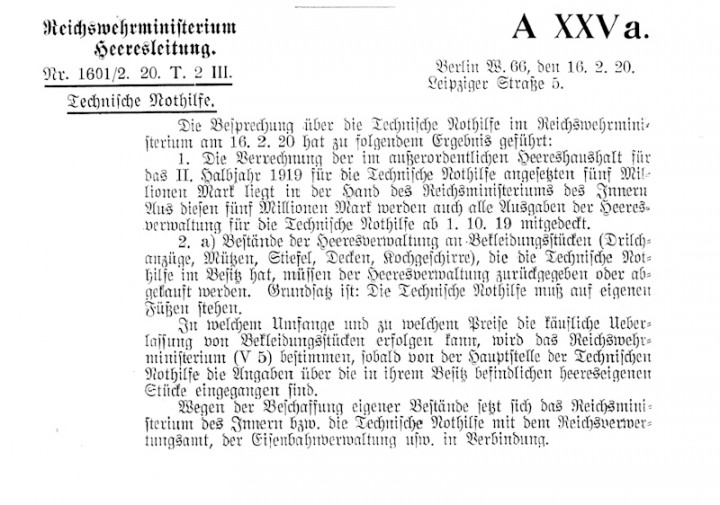 Nach der Gründung als Technische Abteilung im Jahre 1919 besaßen viele Nothelfer als ehemalige Soldaten Bekleidung und Ausrüstung der Reichswehr. Mit Erlass des Reichswehrministeriums Nr. 1601/2 vom 16.2.1920[21] wurde festgelegt, dass die TN „Bekleidungsstücke (Drilchanzüge, Mützen, Stiefel, Decken, Kochgeschirr)“ der Heeresverwaltung zurückgeben oder abkaufen musste. Im Heereshaushalt für 1919 standen für die TN fünf Millionen Mark (heute etwa 4 Millionen Euro) zur Verfügung und sollten für die Beschaffung eigener Bestände eingesetzt werden.