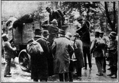 Bei den ersten Einsätzen trugen die Nothelfer feldgraue Uniformen oder auch Zivilkleidung, wie auf dem folgenden Bild[22] zu sehen ist.