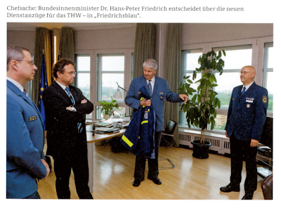Bundesinnenminister Dr. Hans-Peter Friedrich entscheidet über die neuen Dienstanzüge für das THW – in „Friedrichsblau“ (Quelle: BMI)