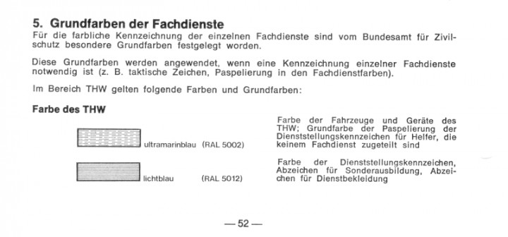 In der THW-Fibel von 1977[4] im Teil I.9 auf Seite 52 wurde die „Farbe des THW“ im Rahmen der Grundfarben der Fachdienste wie folgt festgelegt: