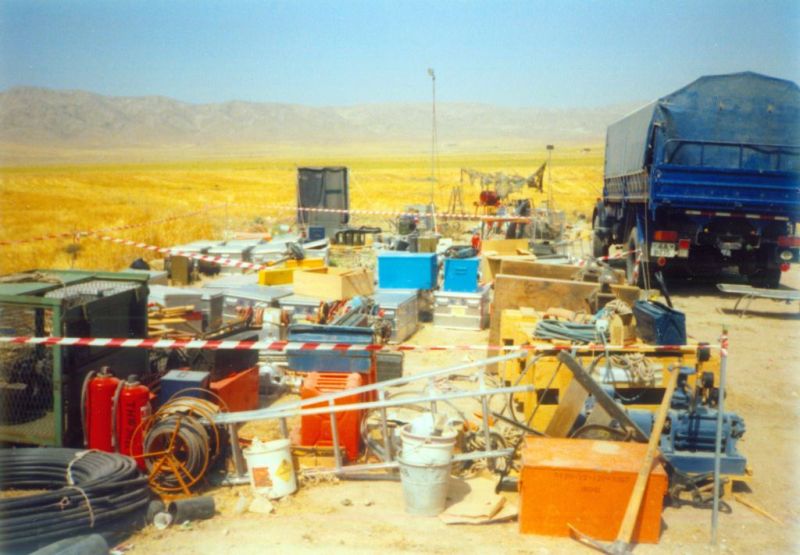 Helfer fahren zum Lager Dandaneh. Hier bekommen sie eine Einweisung über die Versorgungsleitungen und den Behälterplatz. Vom Brunnen wurden ca. 10 Liter Wasser / Ölgemisch abgeschöpft. Dann wurde ca. drei Stunden gespült, das Wasser ist nun