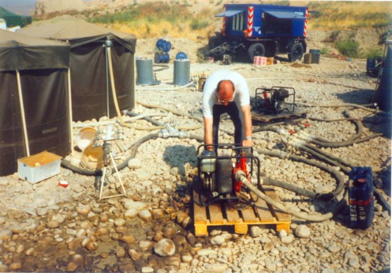 Aus den Brunnen in Dandaneh wird aus 24 m Tiefe das Wasser mit einer TS 2/5 abgesaugt. Das Wasser ist sauber, eine Absenkung (20 cm) kaum gegeben und nach Abstellen der Pumpe läuft das Wasser sofort wieder nach. Die noch fehlenden Längen der Versorgungsleitung zum Flüchtlingslager werden vorbereitet. Einige Zuleitungen werden repariert.