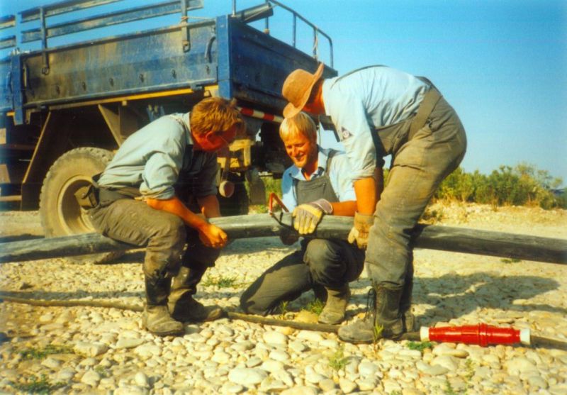Für die dem Camp gegenüberliegende Eisfabrik wird eine ca. 400 m lange Wasserleitung (32 mm) verlegt. Material ist genügend vorhanden und unser „Lohn“ ist freies Eis solange unser Lager besteht.