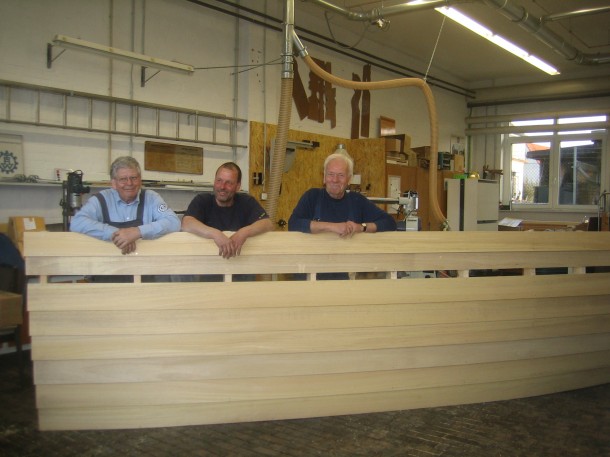 Die kleine Halle, die Gästehalle, soll nach und nach umgestaltet werden. Im hinteren Teil wird eine Art Tresen, der gebaut wird wie ein halbrundes Boot, aufgestellt. Die ersten Arbeiten wurden am Samstag in der Schreinerei der Schule fertiggestellt und in die kleine Halle gebracht.
