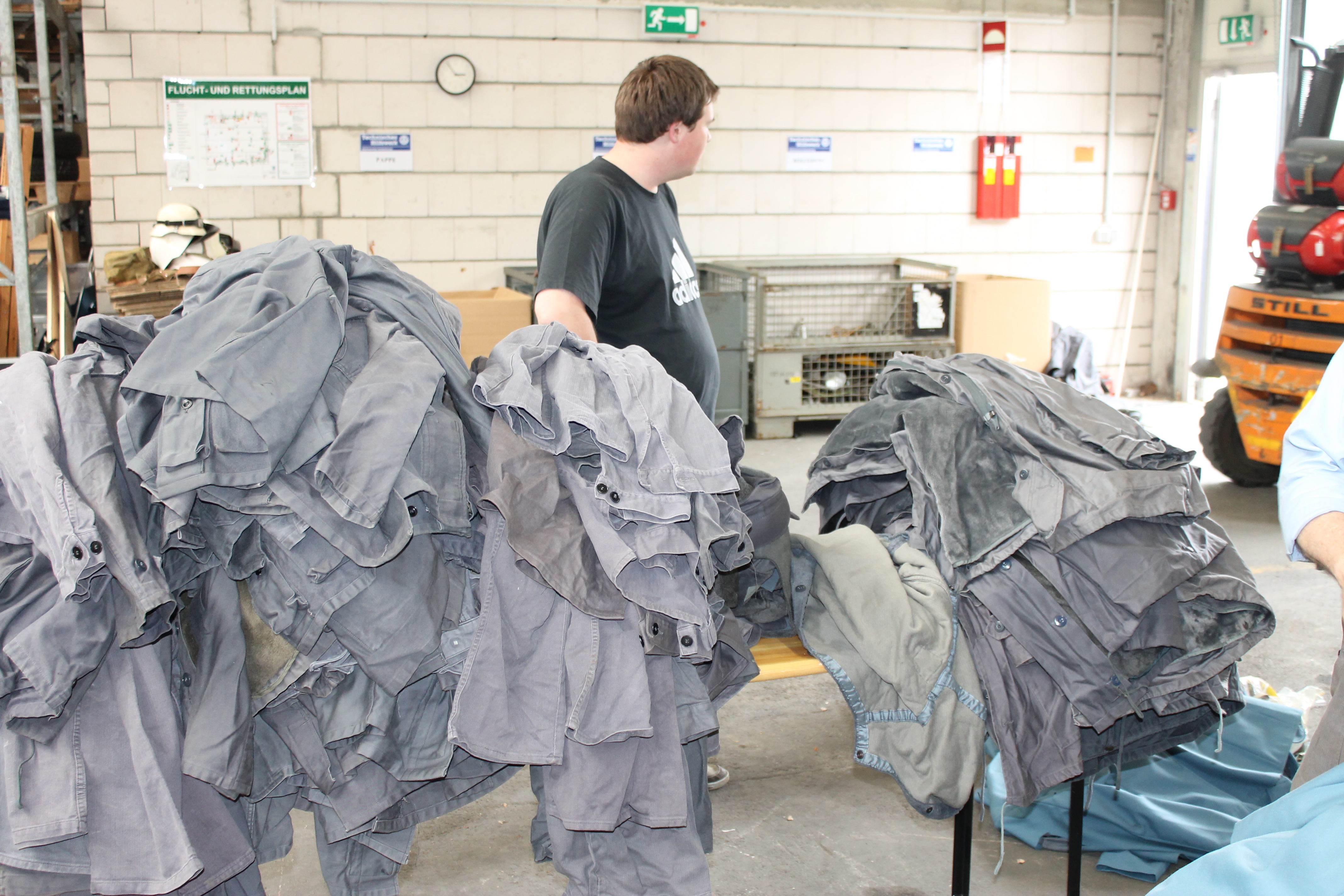 Natürlich wurde an diesem Wochenende Bekleidung (graue Arbeitsanzüge, braune Anzüge, Hüte, Schiffchen, Stiefel) sortiert, die im Laufe der letzten Wochen und Monate in Heiligenhaus eingetroffen war.