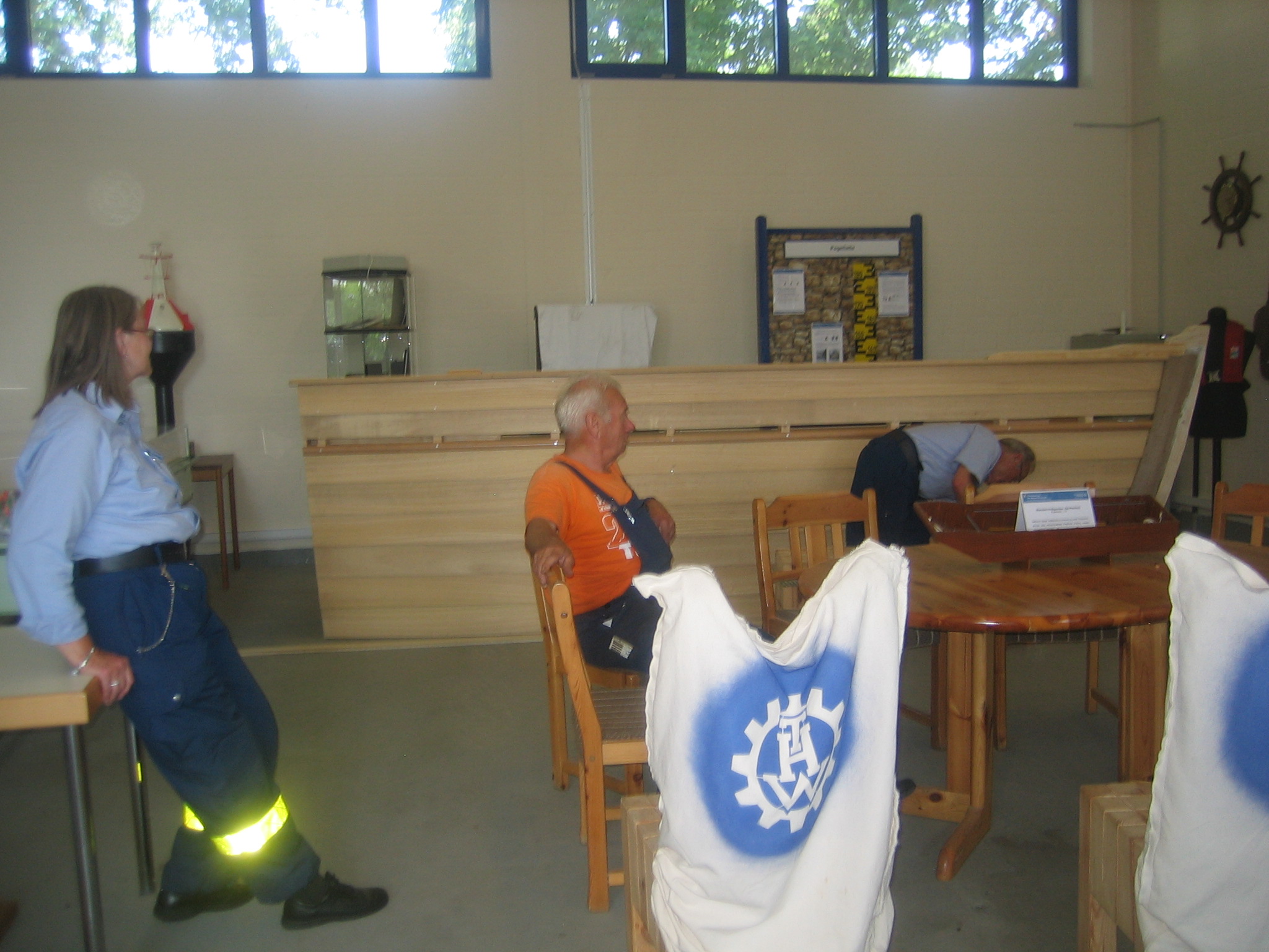 Das halbe Boot, das während der letzten Arbeitstreffen gebaut und das als Abtrennung in der kleinen Halle aufgestellt worden ist, wurde von unserem Schreinerkollegen Dietmar Schrötter fertigstellt. Beim nächsten Arbeitstreffen wird es noch gestrichen und lackiert.