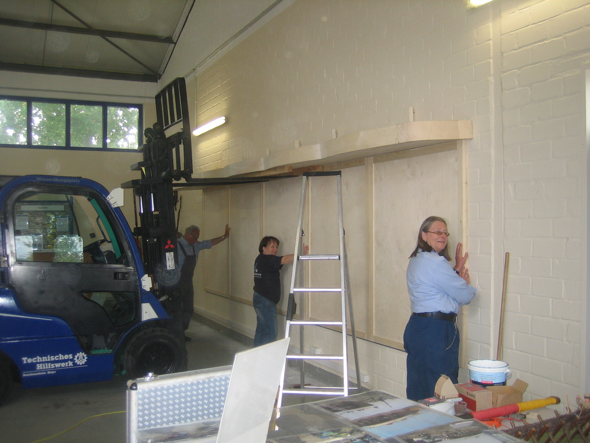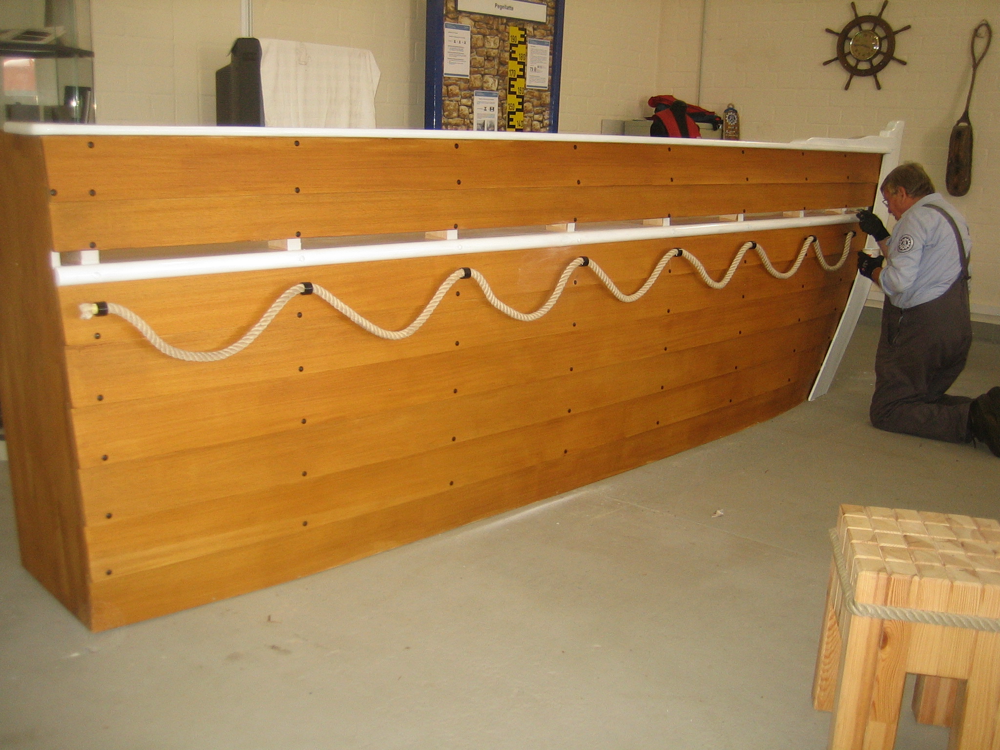 Die rechte Wand in der kleinen Halle wurde umgestaltet.  Bisher waren hier die verschiedenen Rettungswesten, für die Gäste gut sichtbar, ausgestellt. Stattdessen wurden fünf Holzwände an der Wand festgeschraubt, an denen später z.B. kleine Holzkästen fest gemacht werden, in denen im Vordergrund Fragen und auf der Rückseite die entsprechenden Antworten zu lesen sind. Zwischen den einzelnen Holzwänden wurde Seile festgeklebt, die vorher gebändelt wurden, d.h. ein dünnes Band wurde fest um das Seilende gewickelt, anschließend wurde das Seilende verklebt. Über den Holzwänden wurde eine Art Dach angebracht, in das beim nächsten Arbeitstreffen kleine Lampen eingelassen werden.