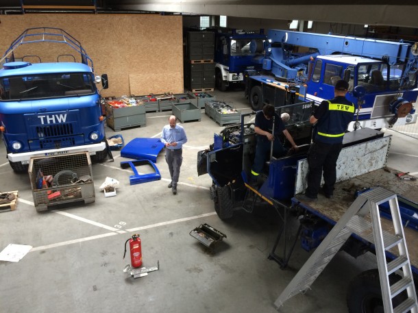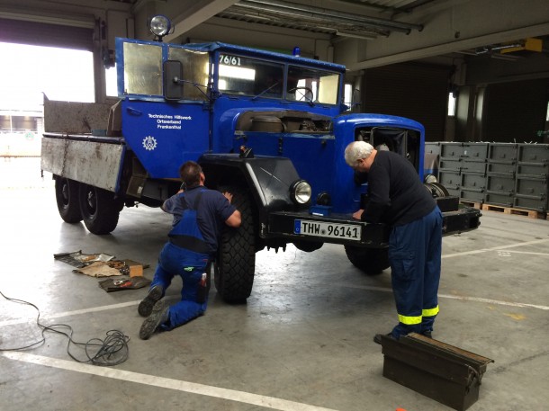 Im THWhS-Fahrzeugdepot in München trafen sich am Samstag, dem 20. September 2014, wieder 6 Mitarbeiter, um an den Fahrzeugen dort weiter zu arbeiten. Es wurde an dem Magirus Jupiter LKW-Kipper mit Demontagearbeiten begonnen, um ihn optisch aufzuarbeiten bzw. die Rostansätze zu beseitigen.