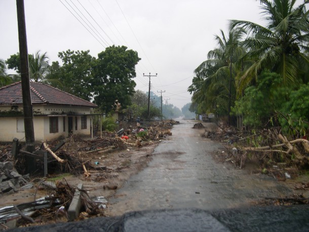 Die Fahrt geht nach einigen Kilometern in die Berge, da die Küstenstraße nicht mehr befahrbar ist. Im Dunkeln fahren wir über Feldwege und durch Wälder weiter bis Galle, einer durch den Tsunami ausgespülten Stadt. Nur wenig ist noch von der Touristenhochburg erkennbar. Menschen haben sich um offene Feuer versammelt und sind sichtbar traumatisiert.