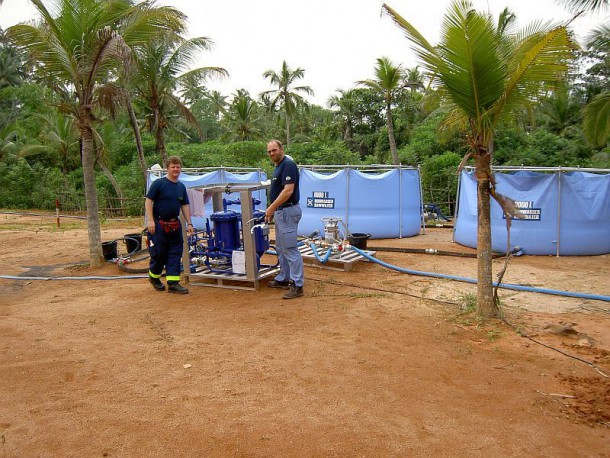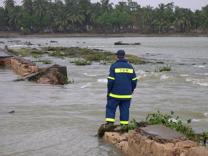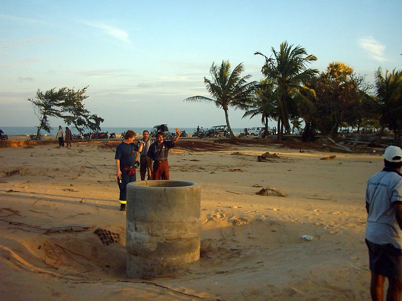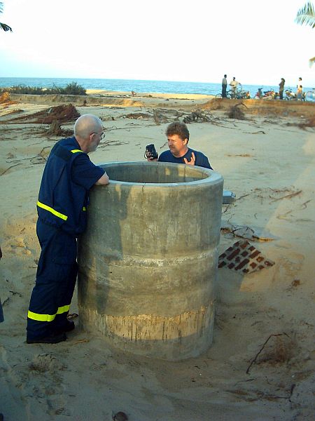 Das Erkundungsteam (Görgen Peter, Hallekamp Mattias und Wiedemann Thomas) erkundeten sofort nach Eintreffen in Batticaloa das Einsatzgebiet im Bereich der Bucht, unmittelbar am indischen Ozean. Hier konnten auf eine Sprung umfangreiche Zerstörungen von Gebäuden, Brunnen, eines Hospitals und eines Tempels festgestellt werden. Bis zu einer Tiefe von 800 m ins Landesinnere sind sämtliche Häuser total zerstört worden. Brunnen, welche hier eine Tiefe zwischen 3 – 5 m aufweisen, wurden in diesem Bereich vollständig zerstört. Im Abstand von ca. 1.800 m zur Wasserlinie des Indischen Ozean wurden die Brunnen überflutet und sind gem. den Angaben der Betroffenen als Trinkwasser im Moment nicht mehr geniesbar. Dieser Zustand hat sich jedoch in den letzten beiden Tagen geändert, da das Wasser aus den Brunnen offensichtlich nicht mehr so salzig schmeckt. Hier wurden Tipps zur Verbesserung der Lage durch das Erkundungsteam gegeben, welche die Betroffenen in den kommenden Tagen versuchen wollen. Von Seiten der örtlichen Verwaltung sind derzeit Überlegungen im Gange, die o.a. Siedlung an einem anderen gesicherten Ort wieder aufzubauen. Die jetzt bestehende Örtlichkeit wird im Moment nicht priorisiert.