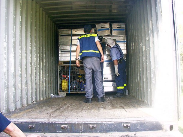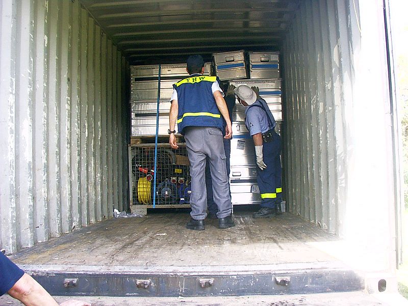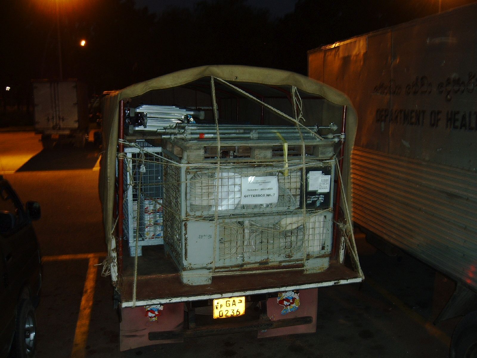 Noch auf der Laderampe wurde das gesamte Material nochmals durch Polizei und Militär durchsucht. In jeden Schlauch wurde geschaut, auch der Tank der Motorpumpen wurde nicht ausgelassen, sogar Werkzeugboxen an Aggregaten mussten geöffnet werden. Allein diese Kontrolle zog sich eine weitere Stunde hin, so dass die Ausstattung gegen 19:10 Uhr auf einem Mini Lkw verladen und auf dem Weg nach Galle versandt werden konnte.