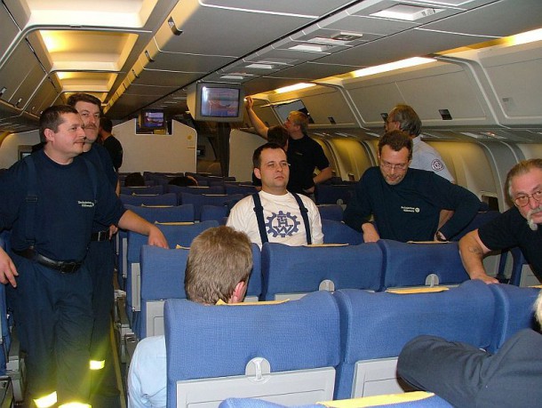 Gegen 20:30 Uhr ging die Fahrt mit einem Flughafen-Bus zum Rollfeld los. Um 21.00 Uhr konnten wir in der BOING 767 Platz nehmen. Die Maschine war vollkommen leer. Außer unserem Team flogen noch drei Helfer der JUH und zwei weitere Helfer einer NGO mit. Begleitet wurden wir außerdem durch Vertreter verschiedener Presseorgane.