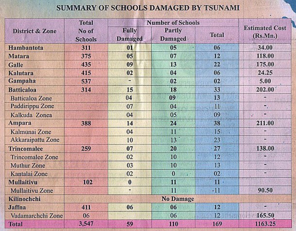 Diese Angaben stammen von einer betroffenen Familie. Die Daten wurden direkt an der Einsatzörtlichkeit erhoben. In Ampara standen den Schülern acht Schulen zur Verfügung. Fünf dieser Schulen wurden total zerstört. Die bestehenden Schulen werden hingegen im Moment als Flüchtlingslager genutzt.