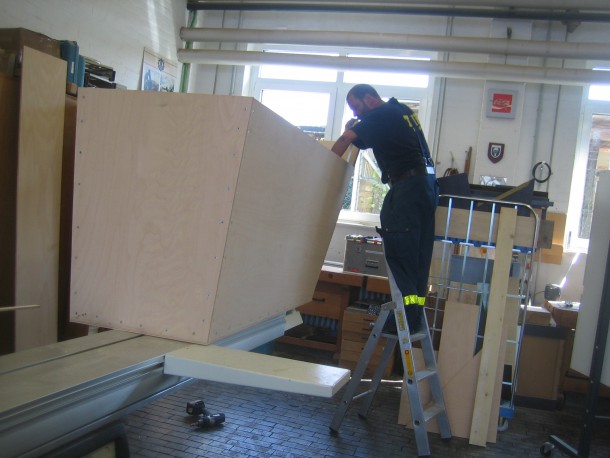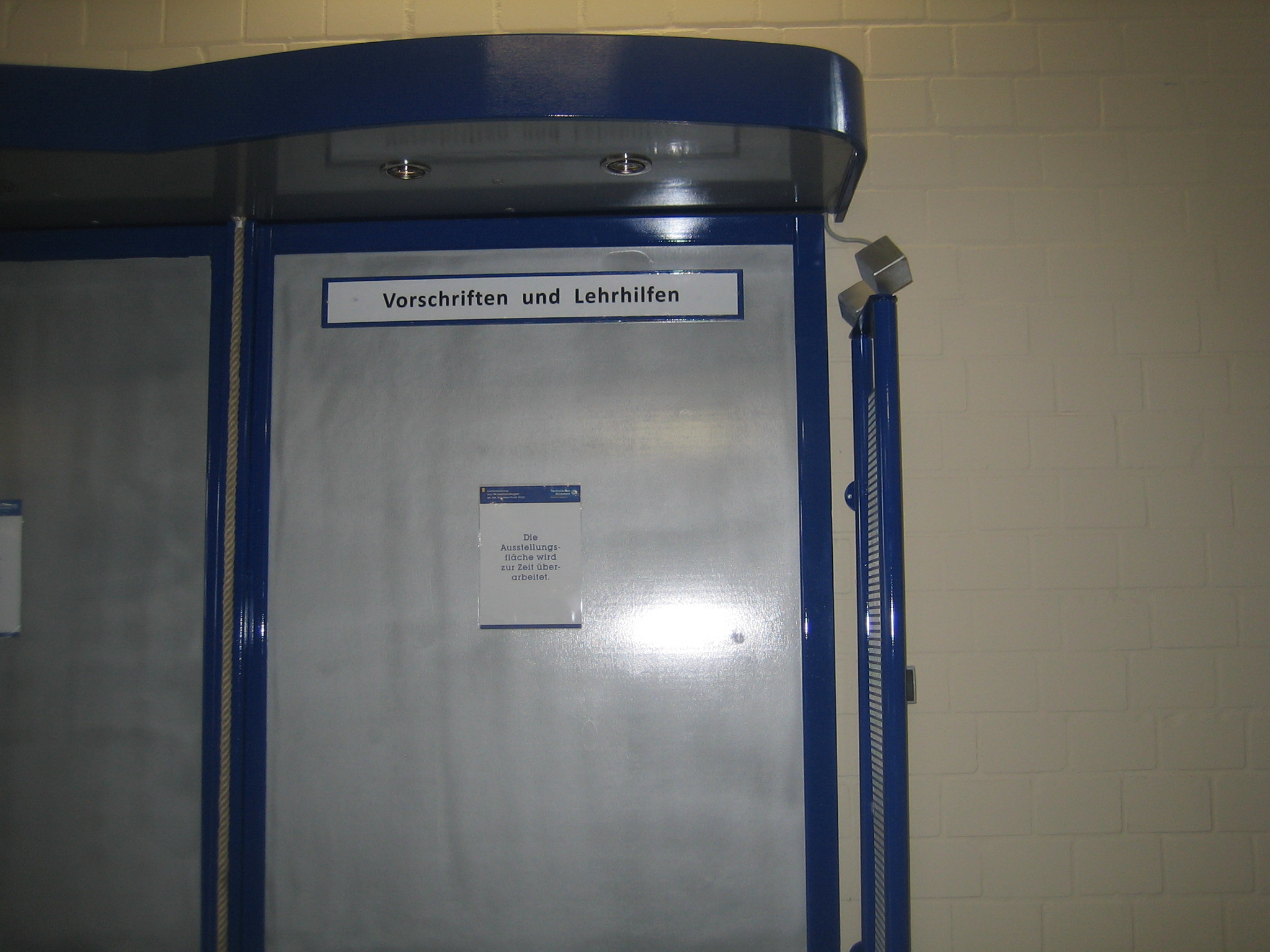 In der Werkstatt der Schule wurden aus Metall Behältnisse geschweißt, die später an der letzten noch leeren Wand auf der linken Seite der Halle befestigt werden sollen. In diese Behältnisse werden verschiedene Vorschriften und Lehrhilfen eingesteckt und die Besucher der Ausstellung können sich über verschiedene Dinge informieren.