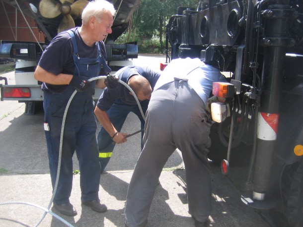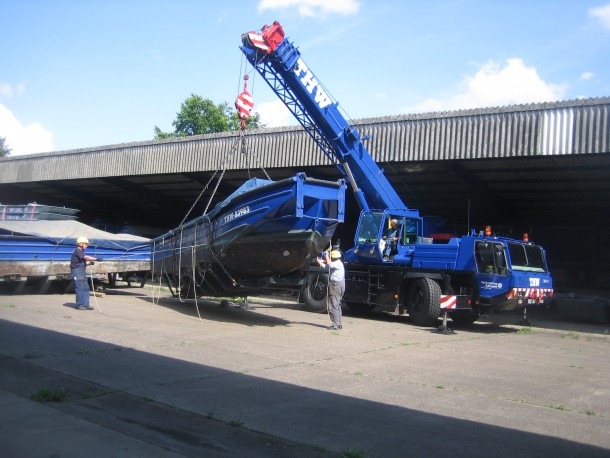 Für diese Arbeiten wurde uns von der Schule der Kran zur Verfügung gestellt. Hans-Heiner Hupe, Kranfachmann der Schule, kam am Nachmittag mit dem Kran und los ging es mit dem Transport der beiden Boote hin und her.