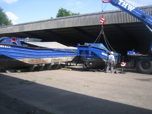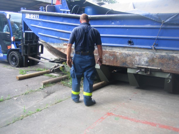 Unter dem Schleppdach stand ebenfalls ein MSB-Boot, das allerdings verschrottet werden soll. Dieses Boot musste herausgezogen und auf den Anhänger verladen werden.
