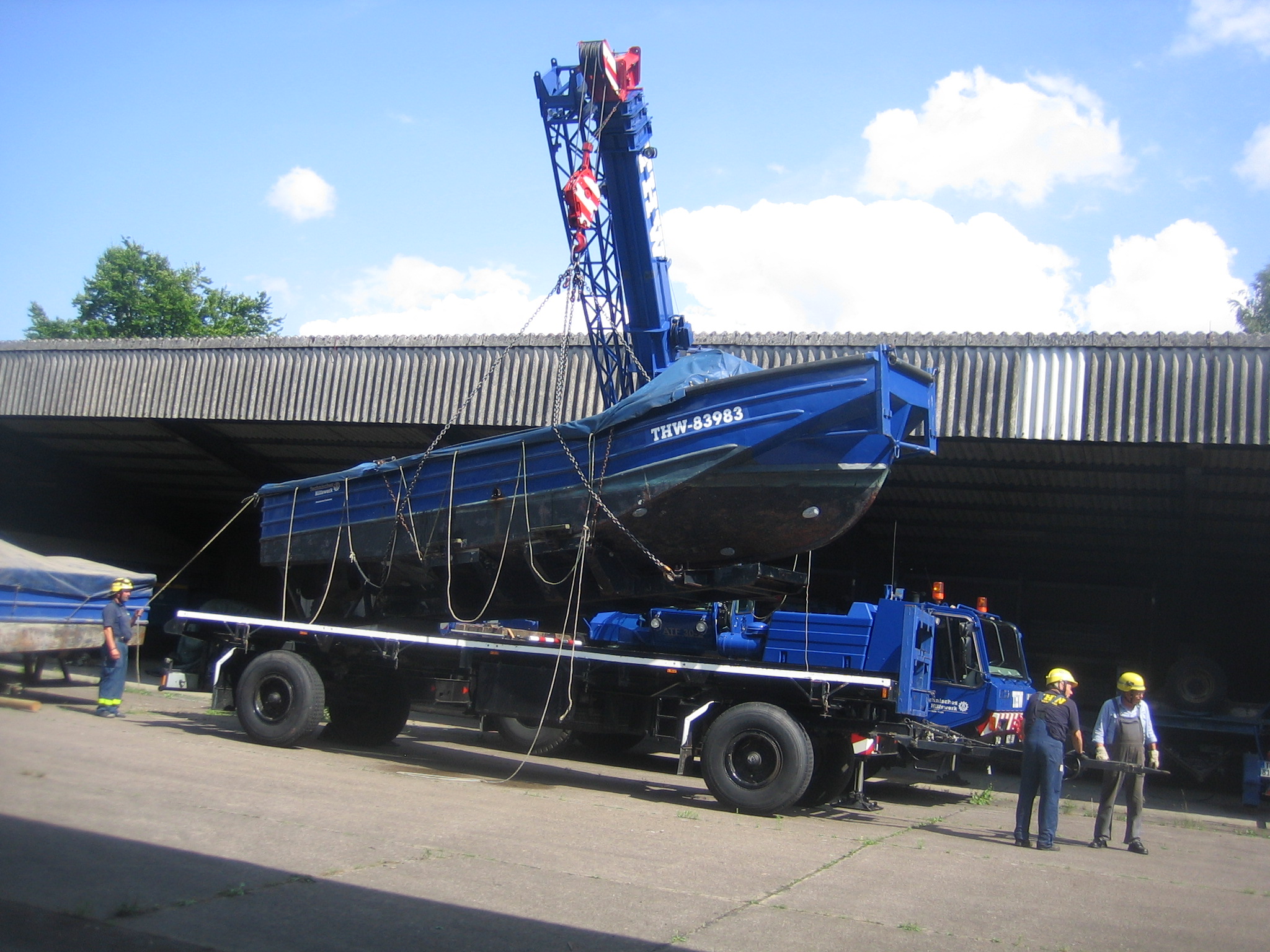 Für Samstag war eine schweißtreibende und arbeitsintensive Arbeit geplant. Das der THWhS überlassene MSB-Boot, das noch auf einem Anhänger stand – so wie es vor einiger Zeit angeliefert worden ist – sollte abgeladen und unter dem Schleppdach abgestellt werden. Es wird, wahrscheinlich im nächsten Jahr, entrostet, gestrichen und neu lackiert.