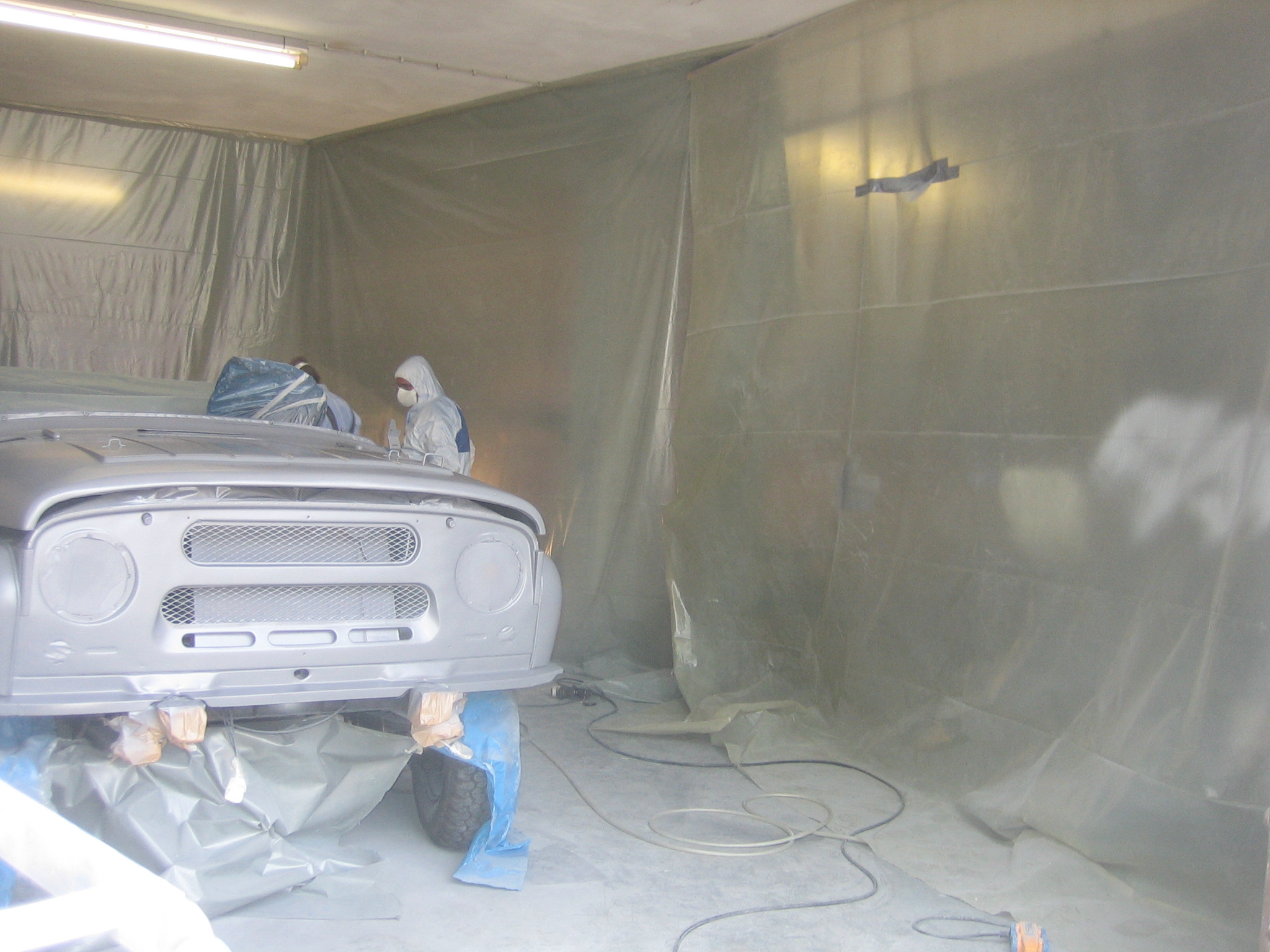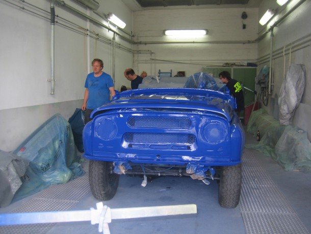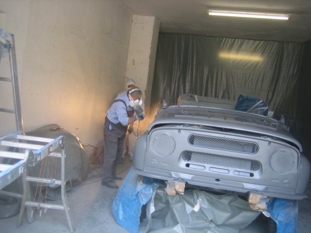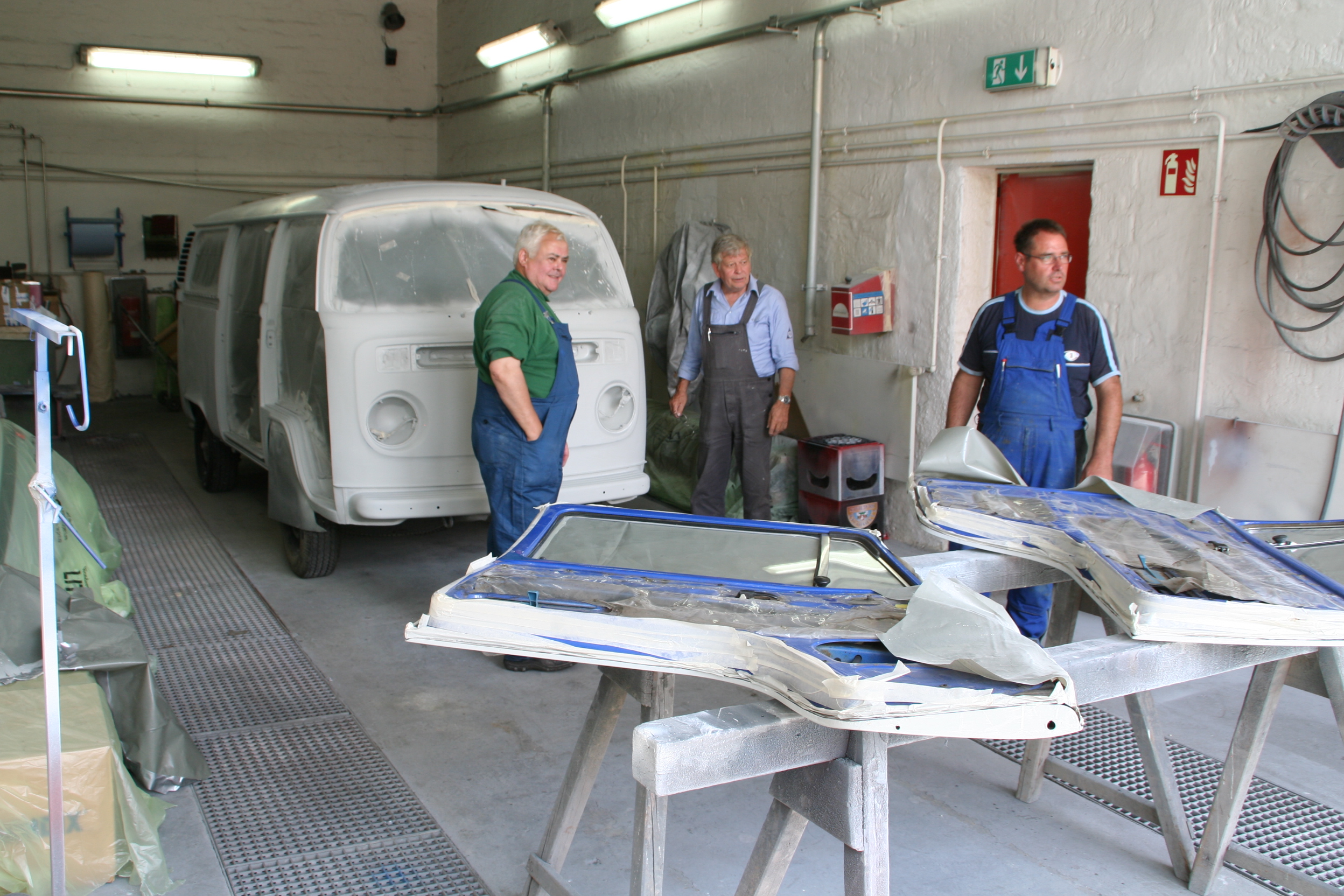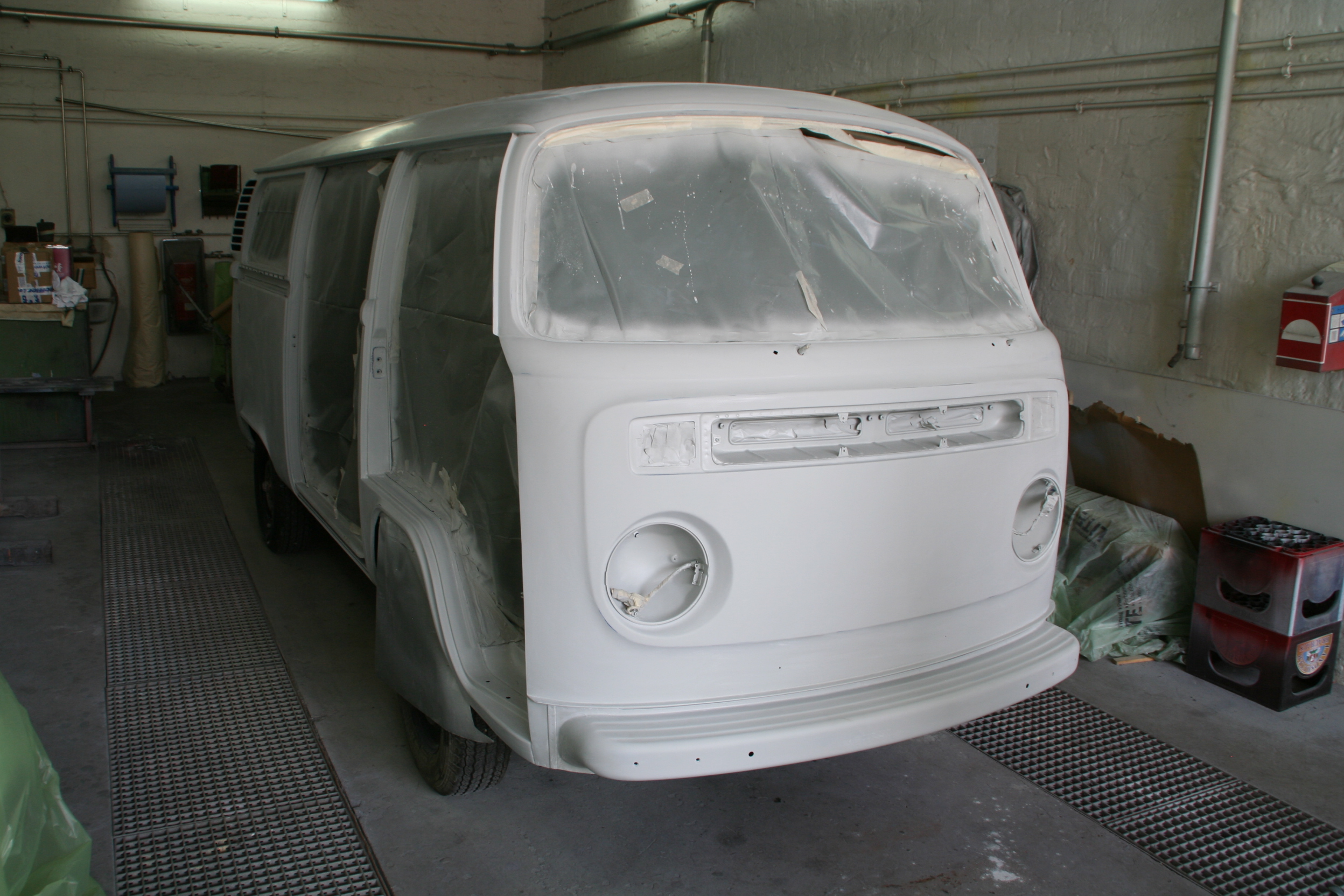 Danach stand auch bei diesem Fahrzeug das Lackieren an. Die Lampen, die Türen wurden ausgebaut und die Öffnungen und Scheiben wurden verklebt.