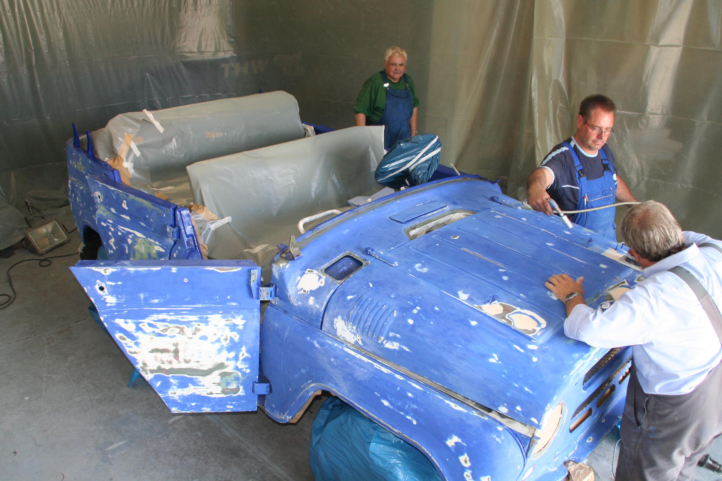 Rainer Perzlmaier setzte das Fahrzeug in seiner Freizeit in sehr vielen Stunden in den Räumlichkeiten des Ortsverbandes Fürstenfeldbruck instand. Da der Motor keine Funktion mehr hatte, musste das Fahrzeug auch technisch instand gesetzt werden. Auch das Blech musste an einigen Stellen erneuert werden. Nach diversen anderen Arbeiten stand der UAZ jetzt zur Lackierung bereit.