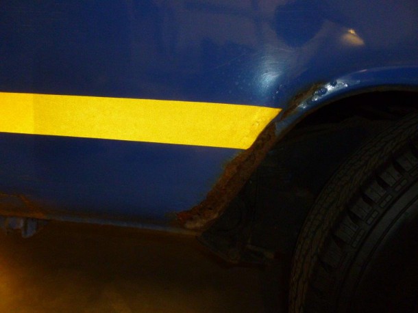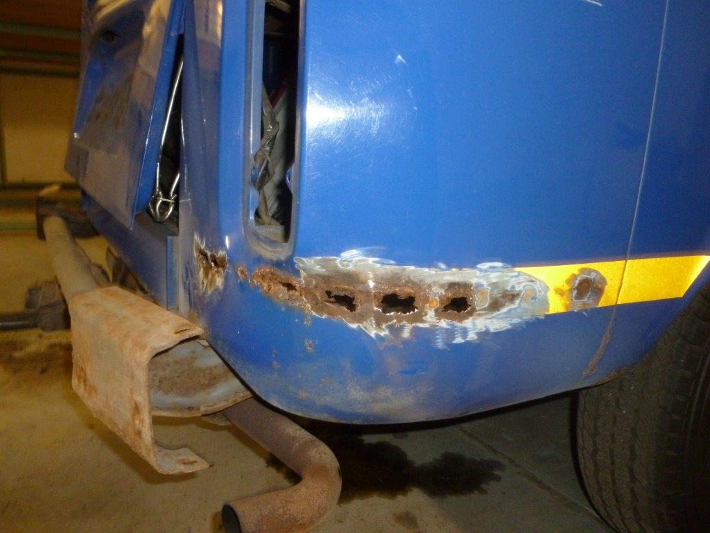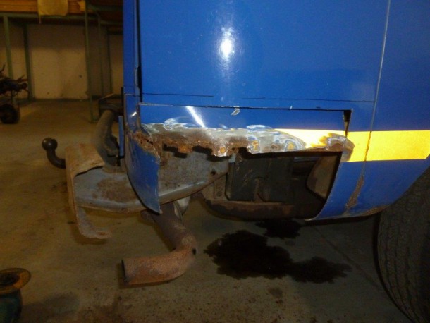 Äusserlich war er noch gut in Schuss, aber nach dem Abbau diverser Anbauteile und der Fensterscheiben wurden doch größere Löcher gefunden. Es wurde deshalb entschieden, die Löcher gegen Reparaturbleche auszutauschen. Auch in den Fensterrahmen fanden sich einige Durchrostungen. Nach der Instandsetzung wurde das Fahrzeug geschliffen und die Grundierung wurde aufgebracht.