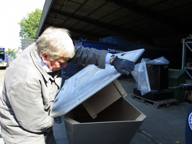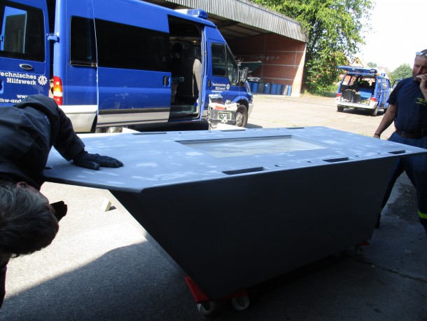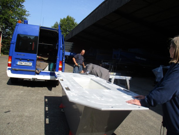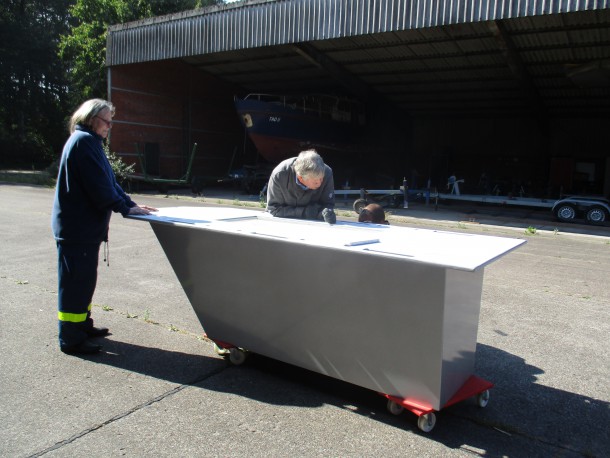 Der Tisch in Form eines Pontons für die Gästehalle ist von Seiten unseres Schreiners fertiggestellt. Bei diesem Arbeitstreffen wurden die Einzelteile – Untergestell, Tischplatte und der Kasten für die Ausstellungsstücke – gespachtelt, geschliffen, grundiert und lackiert.