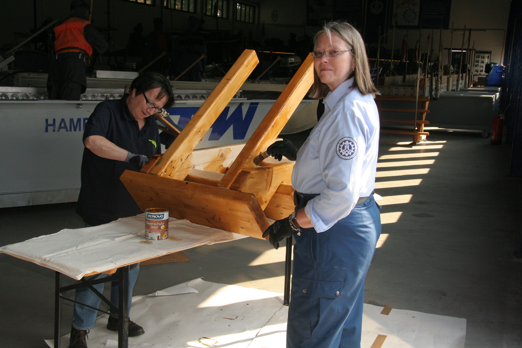 Ein bisher noch nicht gestrichener Treppenaufgang zu einem der Boote wurde zweimal gestrichen und wieder am Boot aufgestellt.