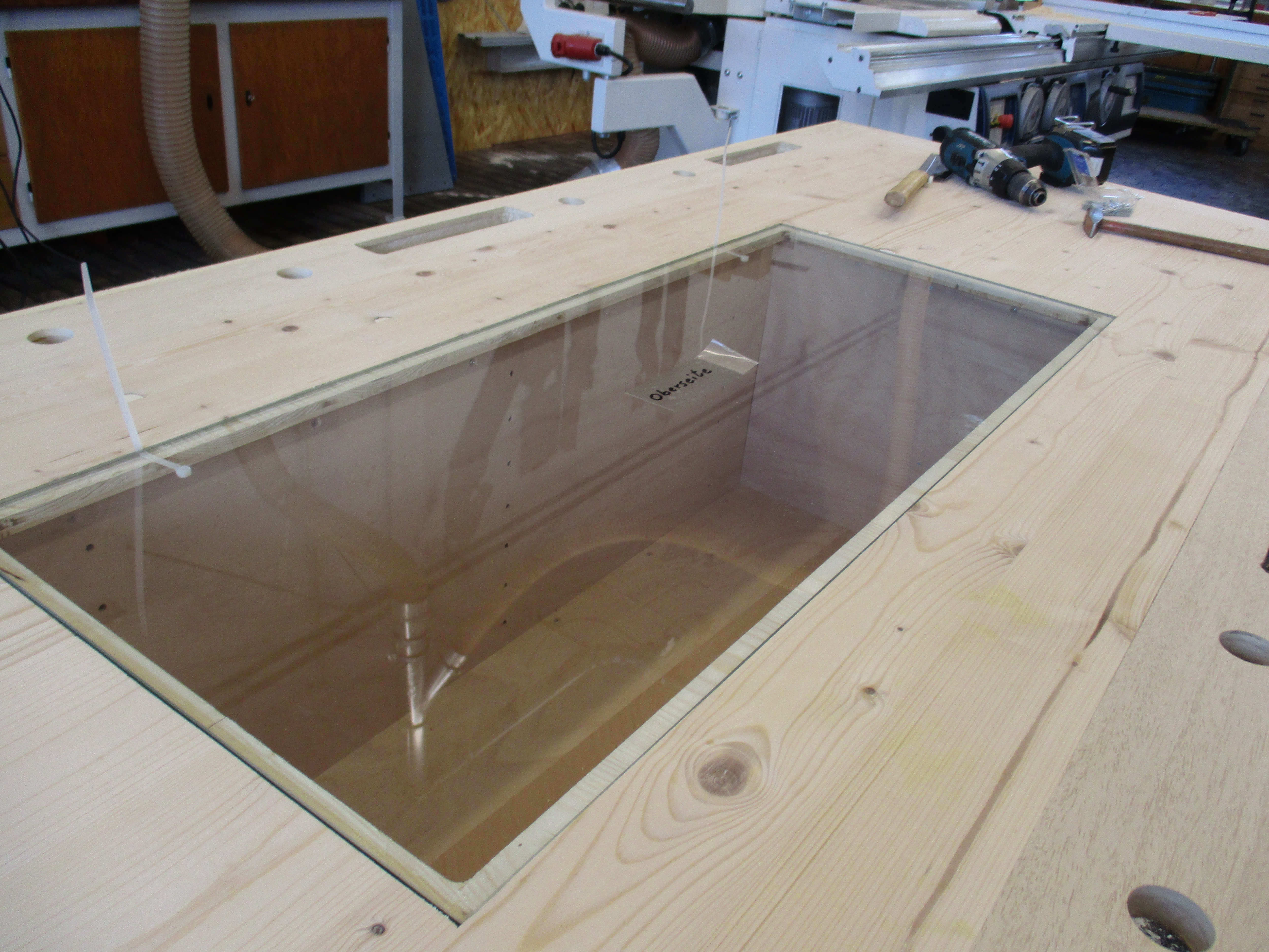 Im Kasten unterhalb der Glasplatte wird beim nächsten Mal Licht verlegt.