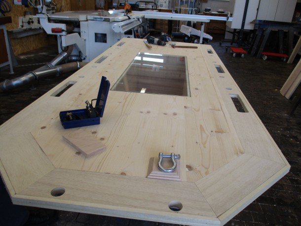 In der Tischplatte ist ein Rechteck ausgesägt worden, das später mit einer Glasplatte abgedeckt wurde. In der Größe der Glasplatte ist ein Kasten eingebaut worden, der unterhalb der Glasplatte angebracht wurde. In diesem Kasten sollen verschiedene Materialien, z.B. ein Modell „Deichverteidigung“, ausgestellt werden.