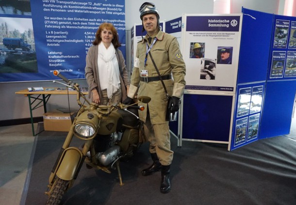 Die Leitung des Messeauftritts lag erneut in den bewährten Händen von Rainer Mahn, dem OB des OV Lübeck. „Das THW zum Anfassen lautet unser Motto“, erklärte Mahn. „Bei uns darf man die Fahrzeuge anfassen, da steht nicht überall ‚berühren verboten‘!“ Gesagt, getan – schon saß wieder ein Messebesucher im UAZ. „Wir repräsentieren hier gegenüber den Gästen aus dem In- und Ausland nicht nur die historische Sammlung, sondern auch das THW an sich“, betonte Mahn.