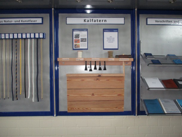 Auf der letzten noch nicht belegten Wand auf der linken Seite der kleinen Halle wird ab diesem Arbeitstreffen die Erklärung, was ist „Kalfatern“ und Kalfater-Werkzeuge gezeigt