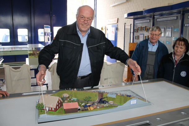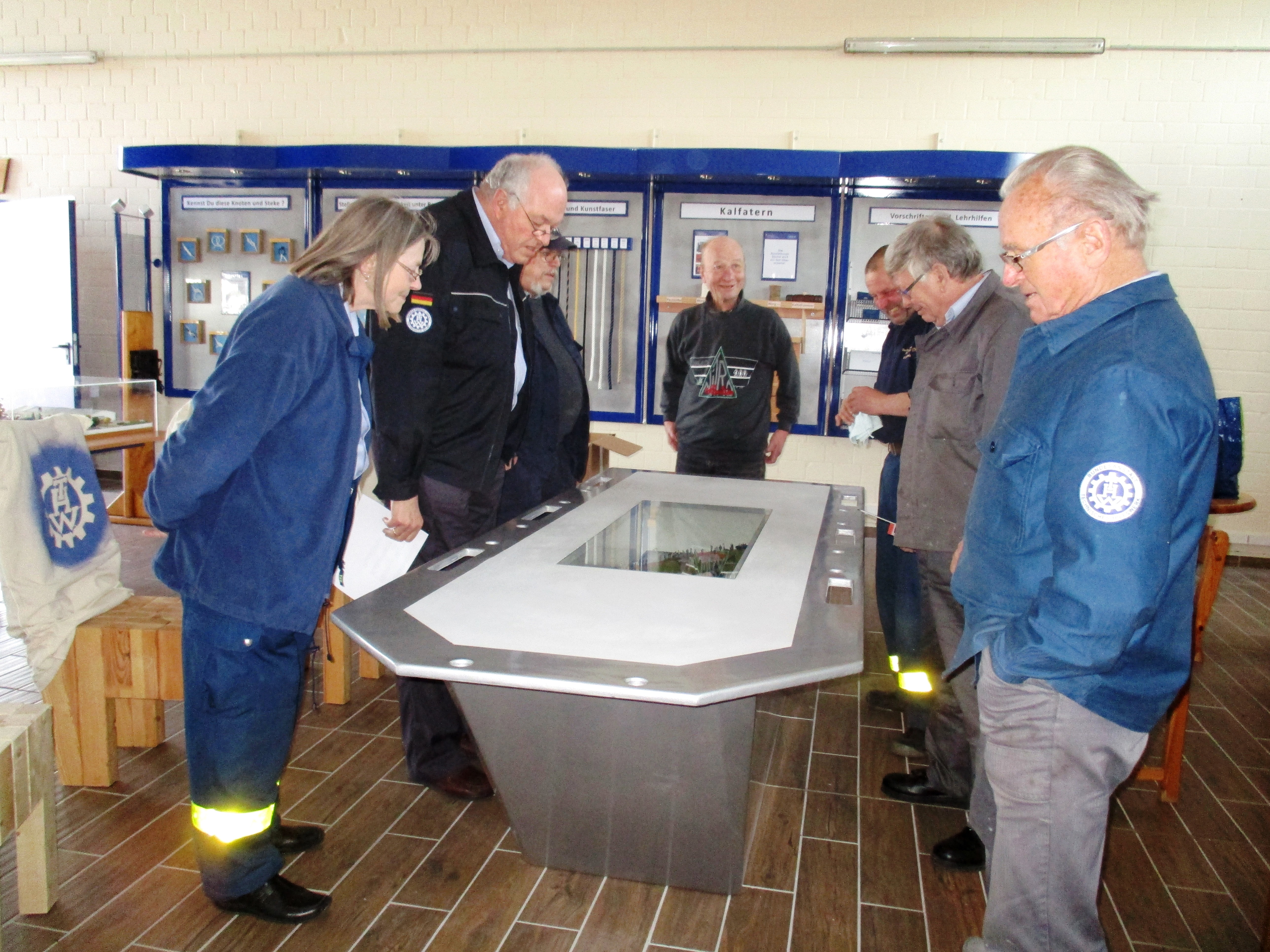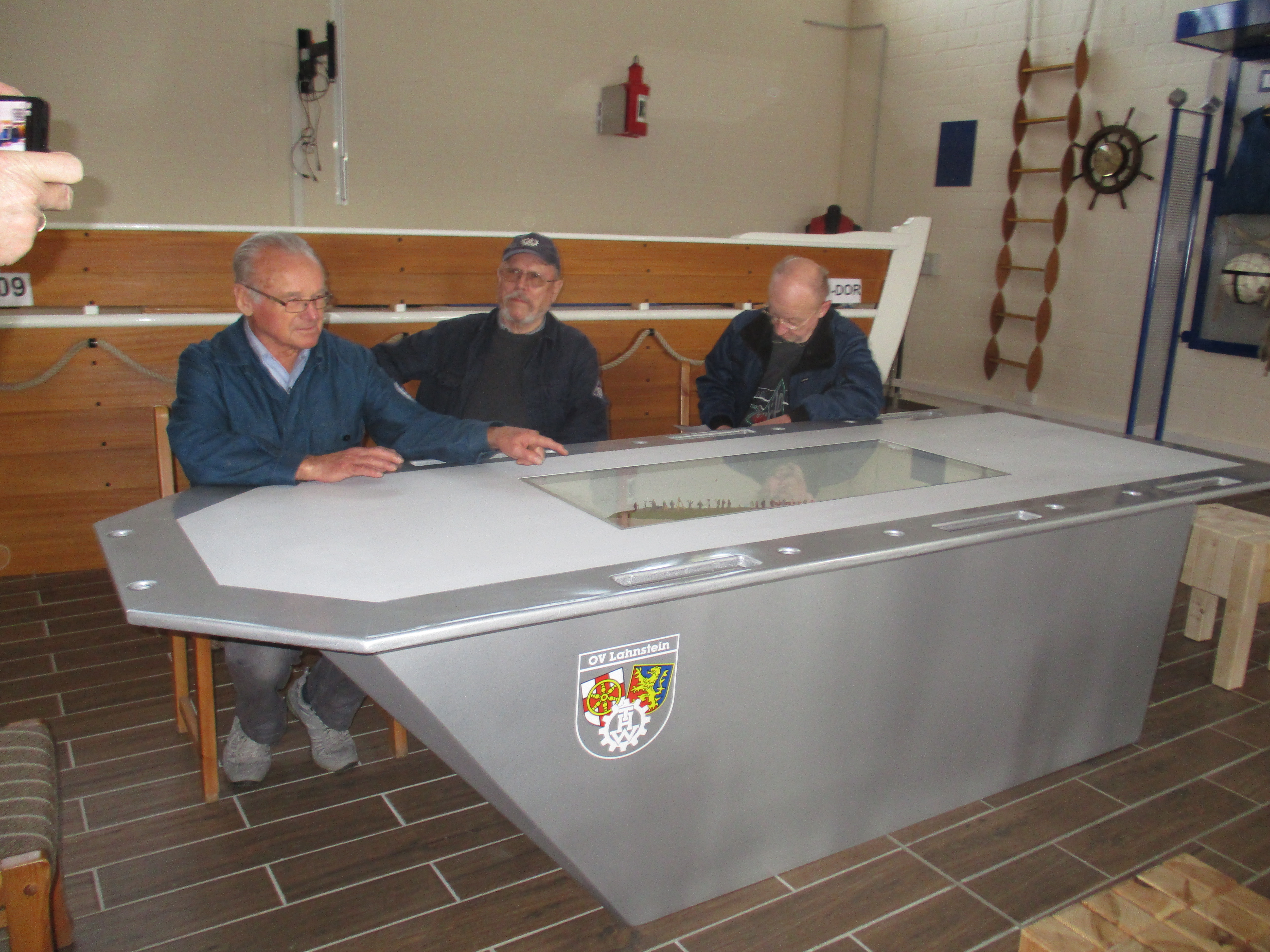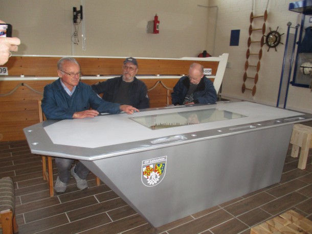 In der Mitte des Tisches war eine Vertiefung eingearbeitet, in der ein Modell ausgestellt werden soll. Dieses Modell, ein von Helmut Kaiser hergestelltes Diorama über Deichverteidigung, wurde beim diesem Arbeitstreffen in den Tisch eingelassen.