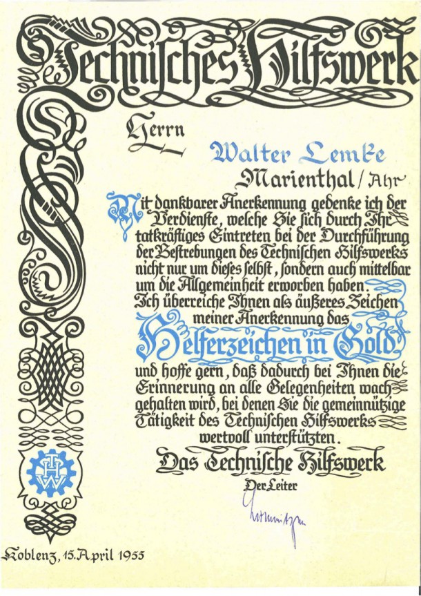 30.08.1951 – 18.12.1970 Dienstzeit im Technischen Hilfswerk (THW)
