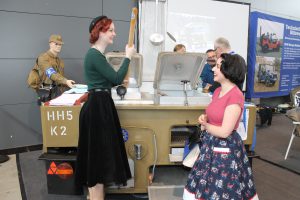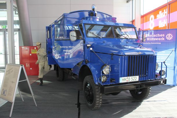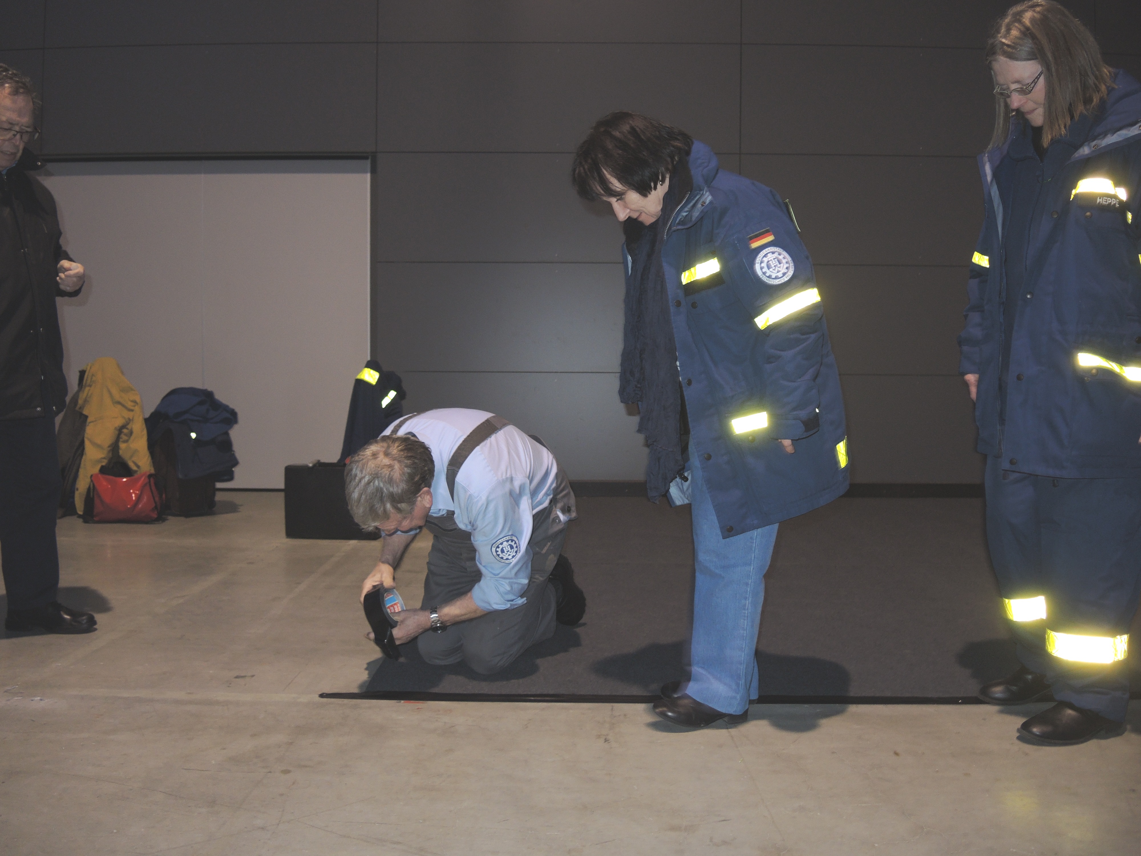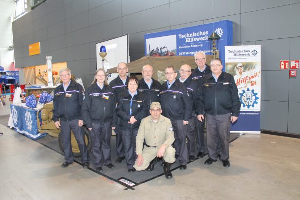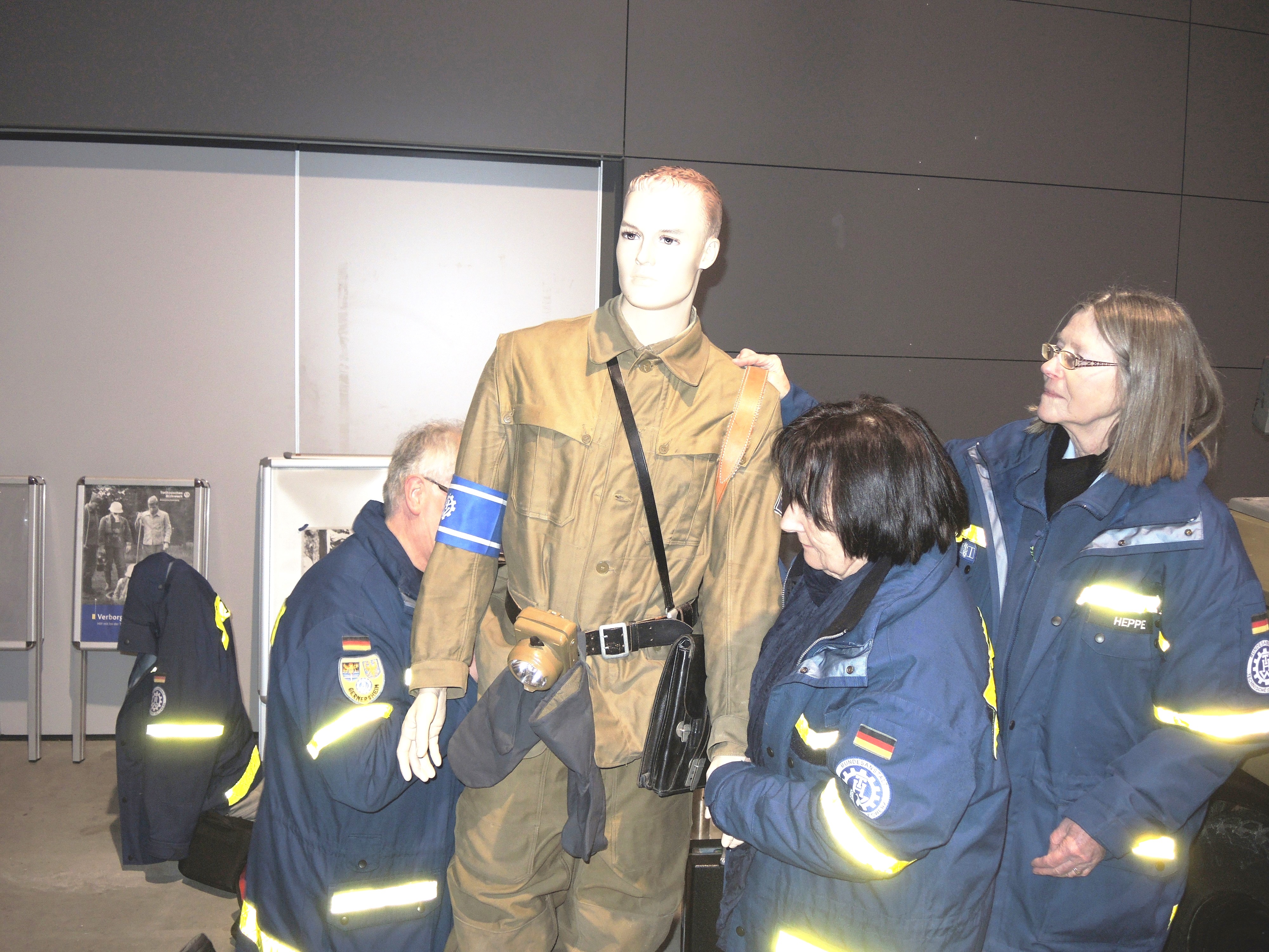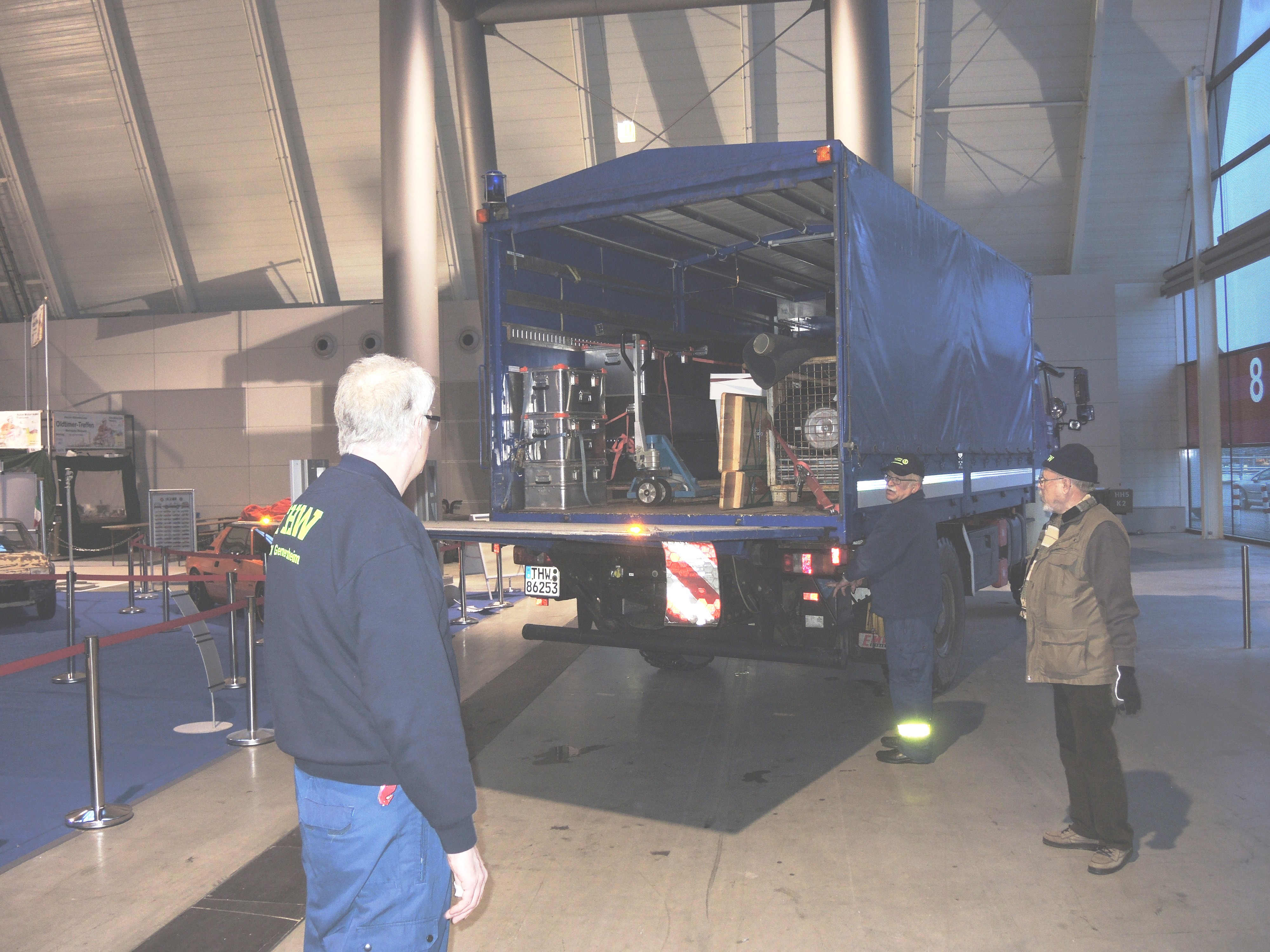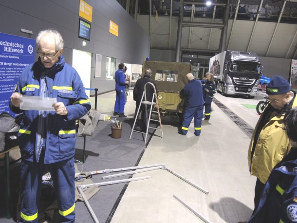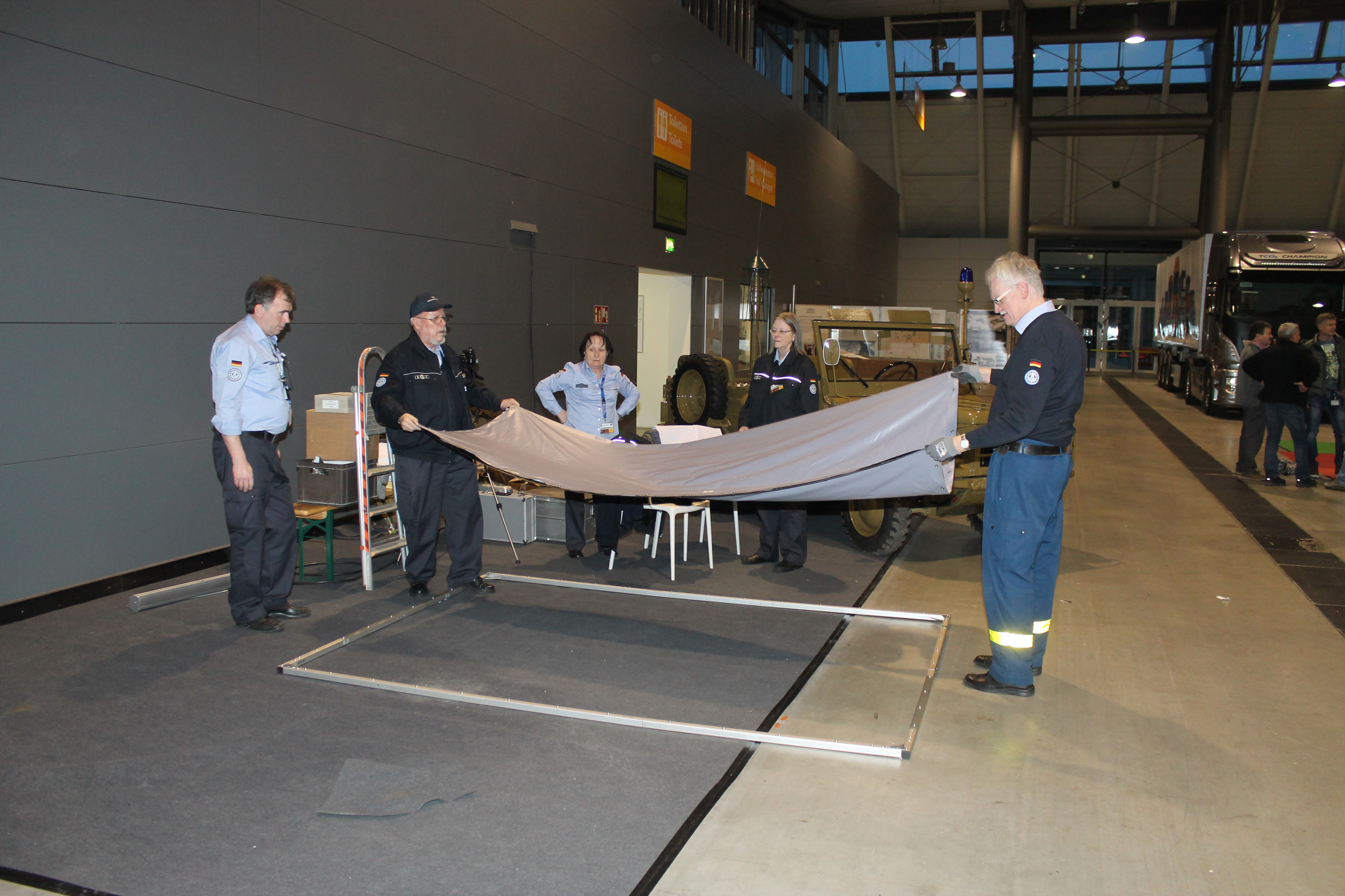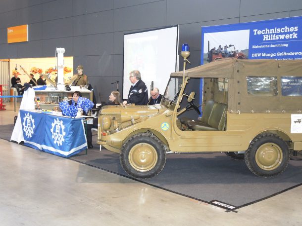 Der Beamer und der Tisch für das Werbematerial wurden aufgebaut. Als Werbematerial gab es Kugelschreiber, Parkscheiben, Zollstöcke, Luftballons, Pflasterheftchen, kleine Helme als Flaschenöffner, Bastelbögen, THW-Fähnchen und THW-Abzeichen. Ausgelegt haben wir außerdem die im vergangenen Jahr erschienene THWhS-Broschüre „20 Jahre THW-historische Sammlung“, die von den Besuchern sehr gut angenommen worden ist.