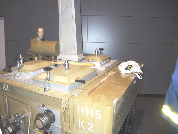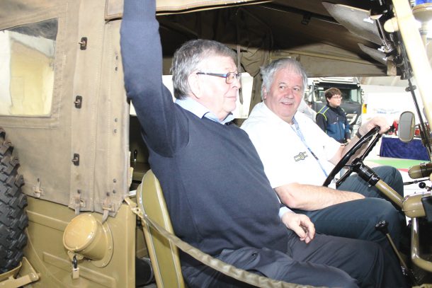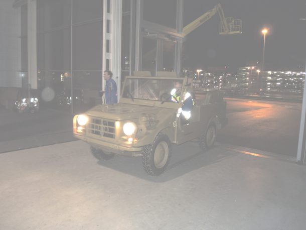 Nach Beendigung dieser Arbeit wurde der von Rudi Heppe restaurierte Munga, die Feldküche aus Germersheim und der MKW aus Niedersachsen in die Halle gefahren.