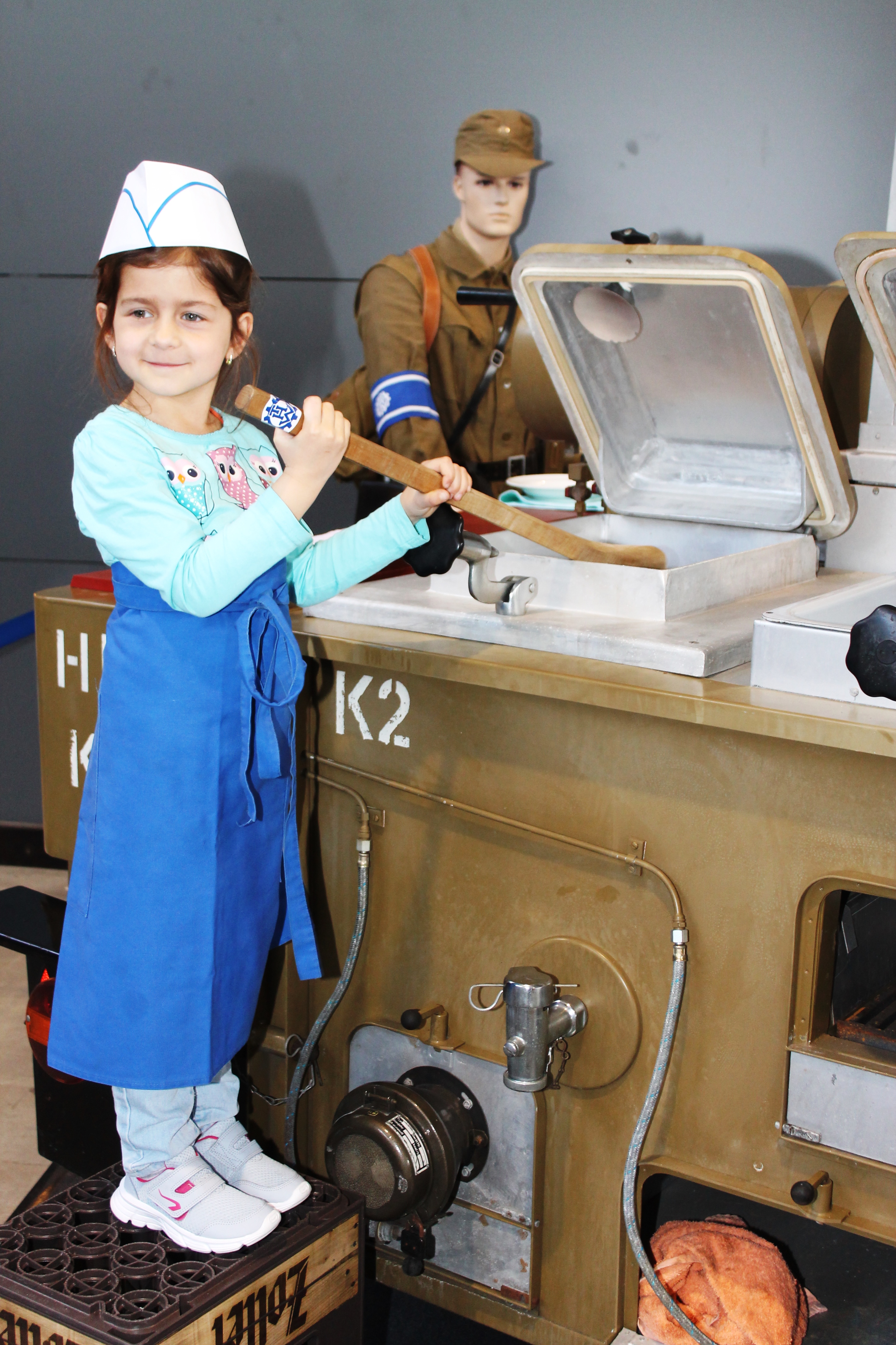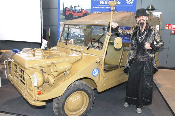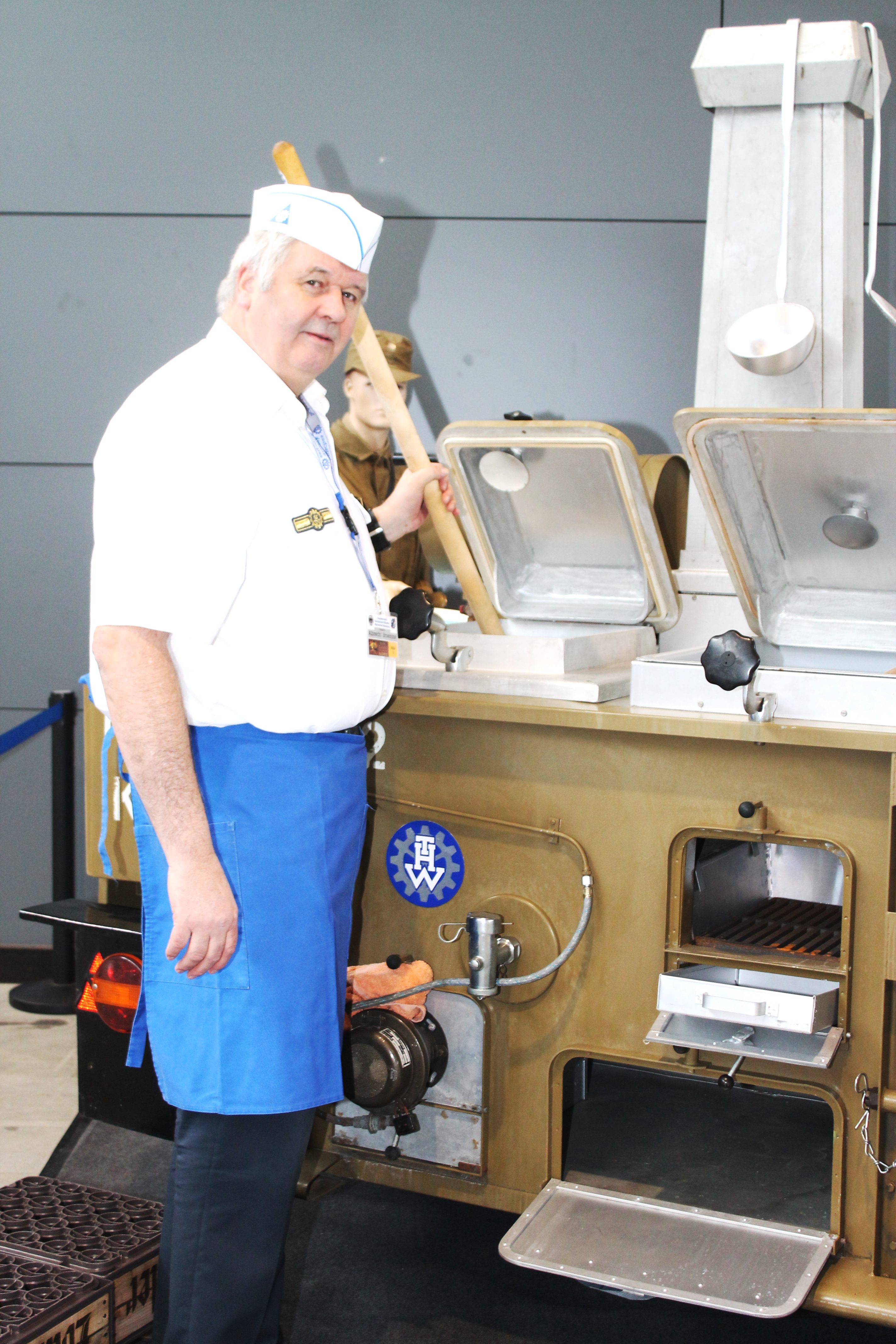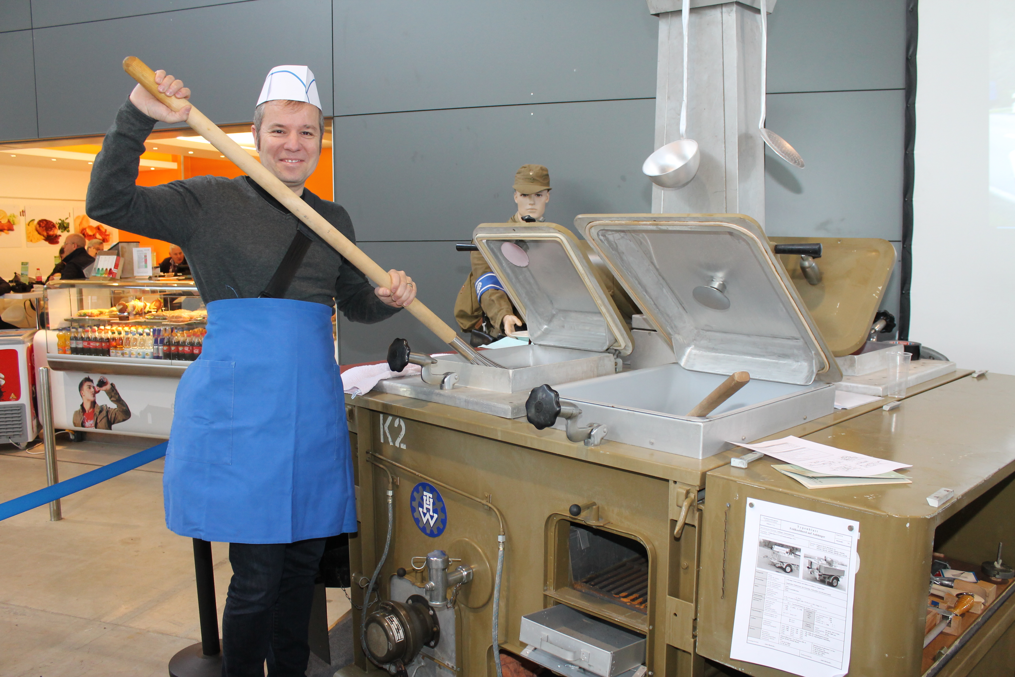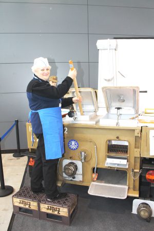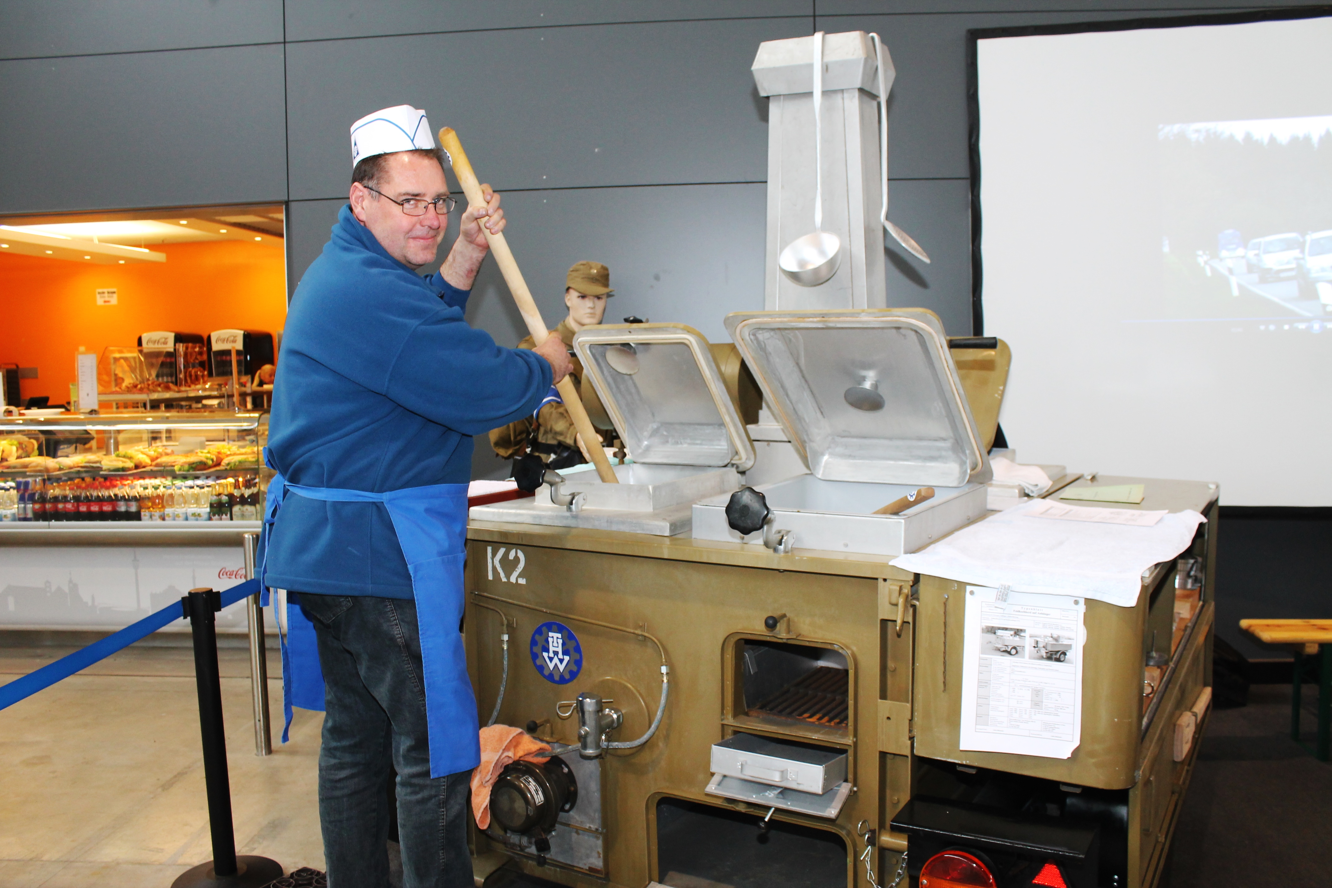 Die Feldküche war in erster Linie zwar nur als Ausstellungsstück anzusehen, interessierte Besucher konnten wir aber dazu überreden, so zu tun, als ob in einem Kessel der Feldküche Suppe wäre und sie diese umrühren. Sie bekamen eine blaue Schürze umgebunden und eine weiße Kochmütze aufgesetzt, allen voran haben Präsident Broemme und Frau Follak ‚die Suppe umgerührt‘. Als „Honorar“ bekamen die Besucher eine Warnweste, ein Warndreieck und einen Verbandskasten geschenkt.
