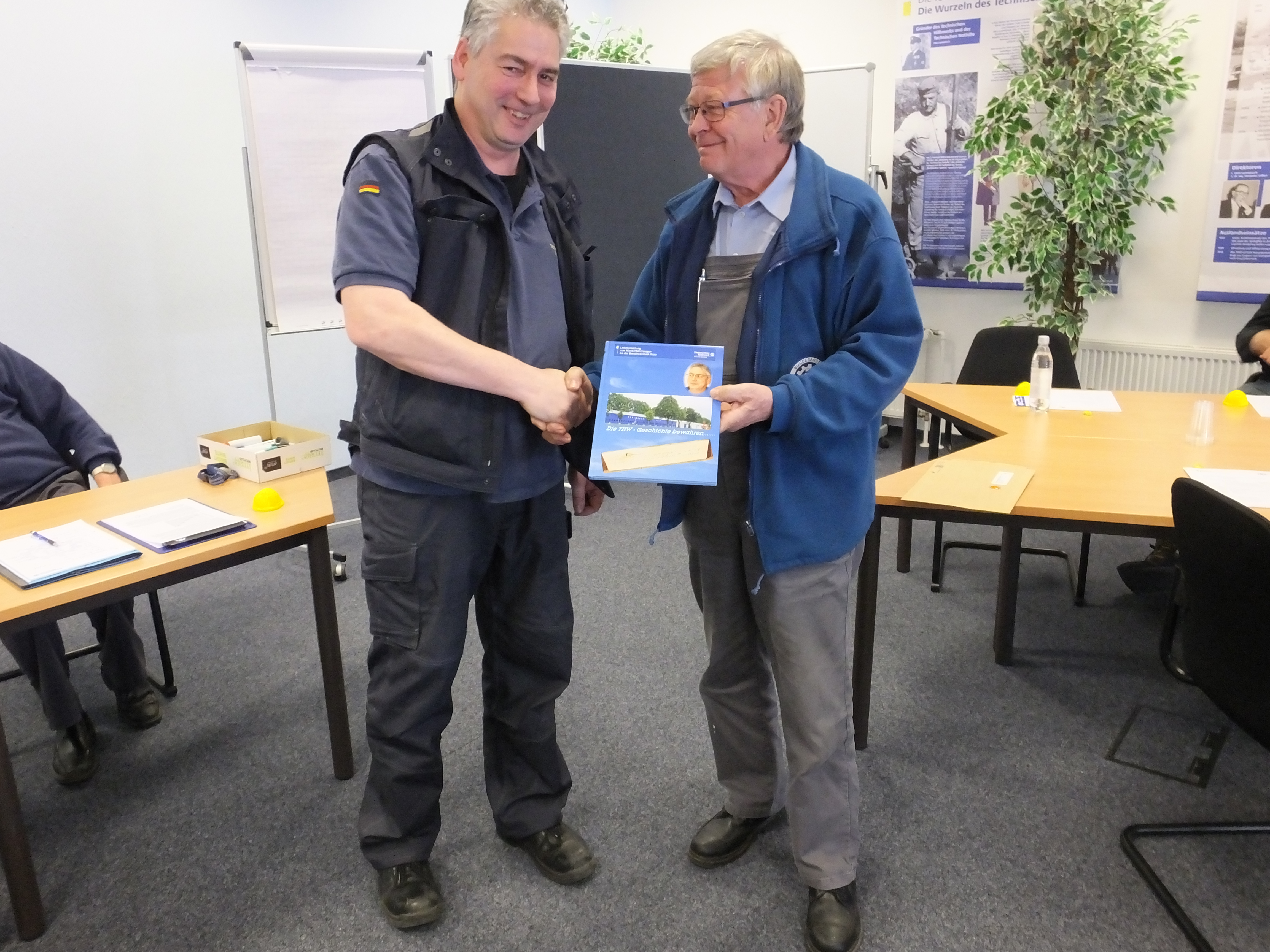 Danach überreichte Rudi Heppe als Dank für seine Arbeit und seine immerwährende Hilfe für die THWhS ein Buch mit Bildern und Beschreibungen über die Arbeit der THWhS an Peter Stratmann vom Logistikzentrum.