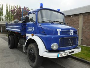 Vom Ortsverband Weilburg ist der THWhS ein THW-Kipper überlassen worden. Er war beladen mit ausgesondertem Material aus dem Ortsverband Zweibrücken. Der Kipper wurde abgeladen und später in die Halle gefahren.
