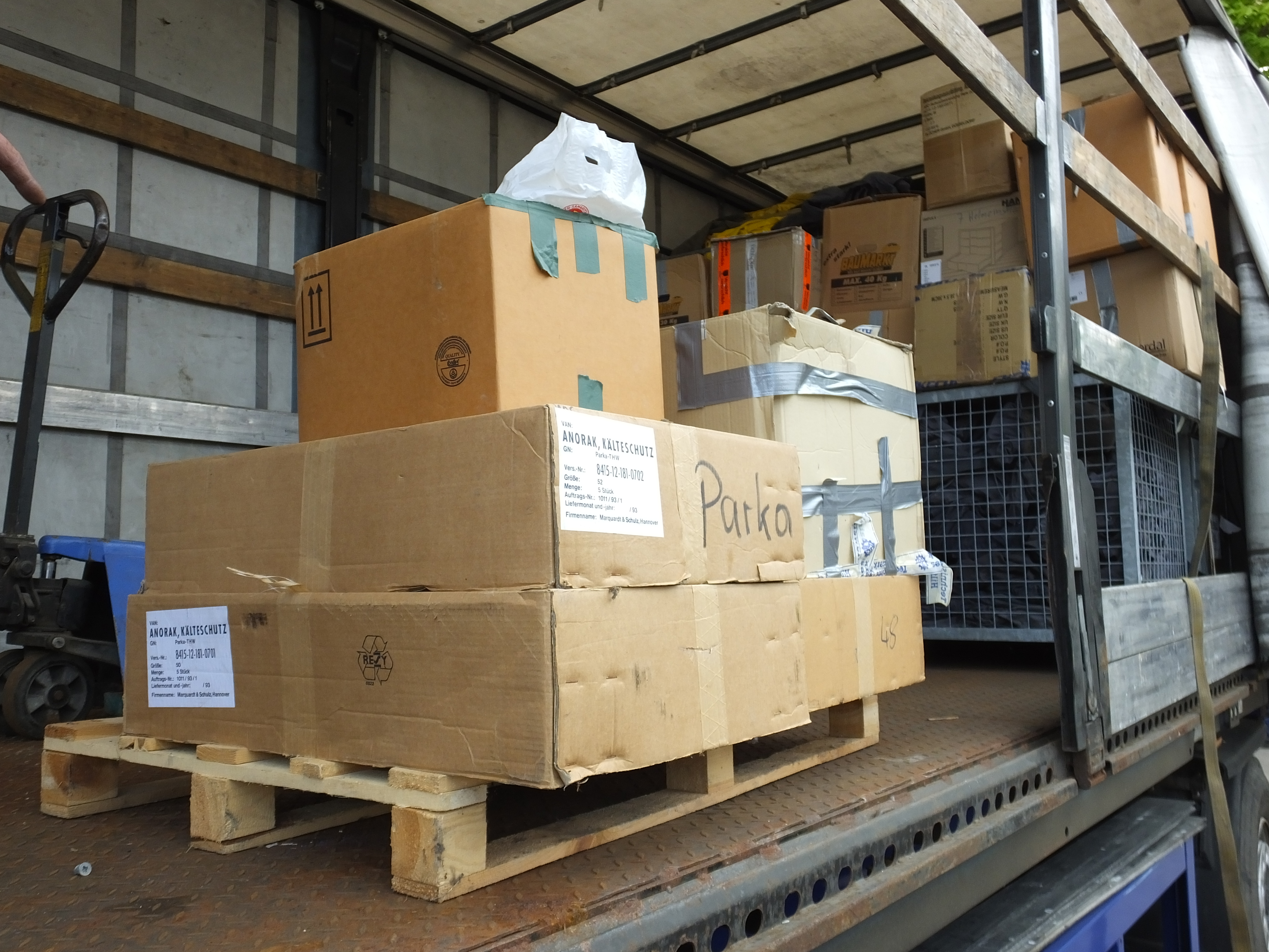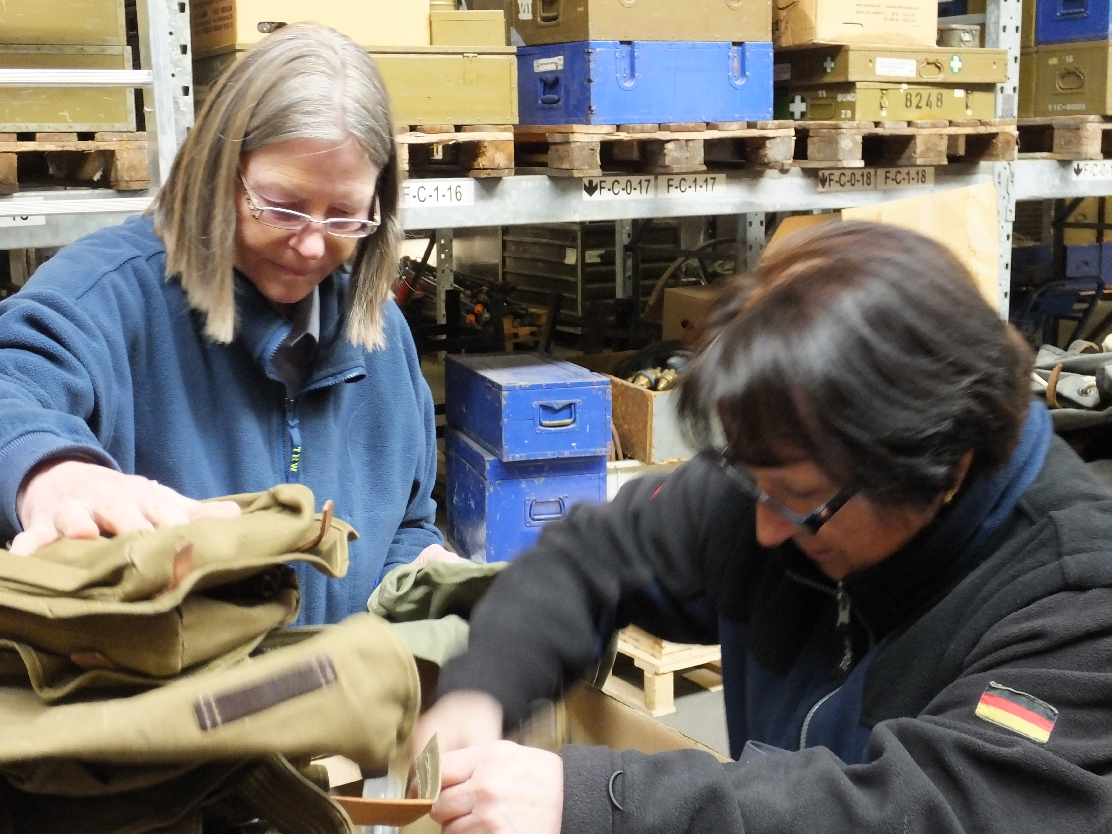 Auch an Bekleidung (Anzüge, Hemden, Mützen, Schuhe, Brotbeutel etc.) ist aus den Ortsverbänden einiges angeliefert worden. Das Material wurde ebenfalls gesichtet, sortiert, gezählt, in die Inventarliste eingetragen und in Kartons eingelagert.