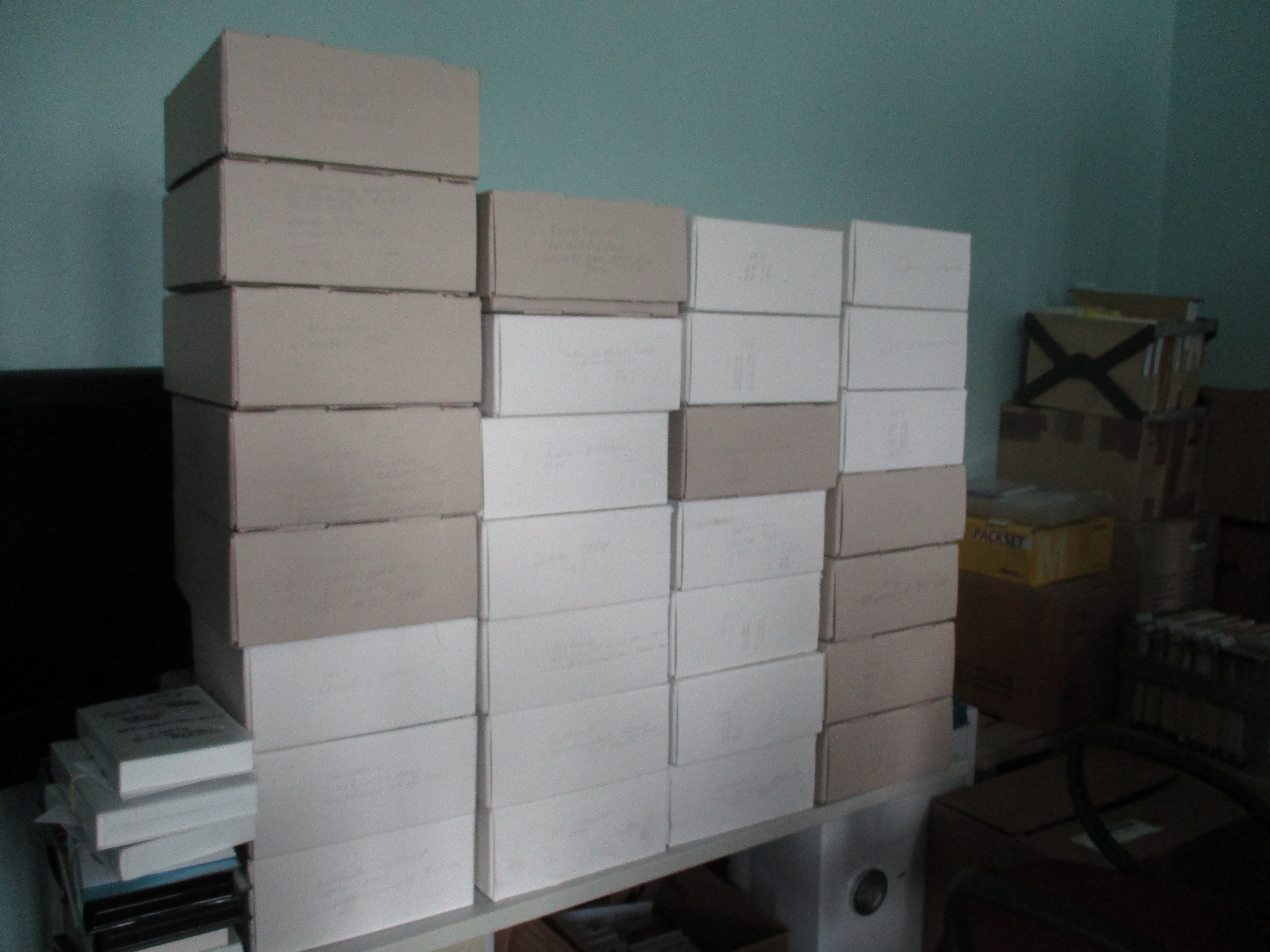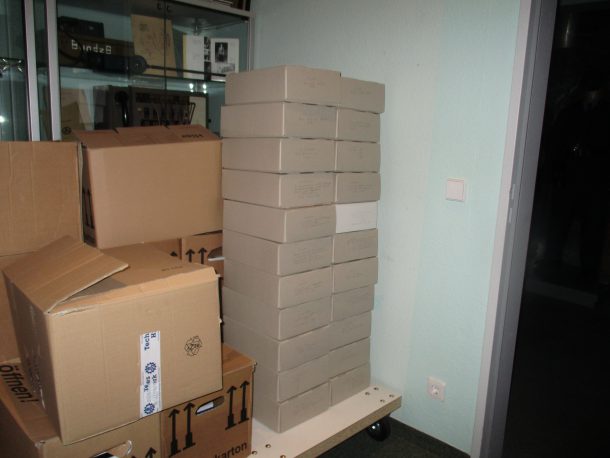Bereits sortierte und abgeheftete Auslandsunterlagen, die bisher in Umzugskartons untergebracht sind, wurden – geordnet nach einzelnen Auslandsprojekten – in Archivkartons eingelagert. Auf den Kartons wurde vorerst nur mit Bleistift geschrieben, welche Projekte sich in den Kartons befinden. Zu einem späteren Zeitpunkt, wenn alle Auslandsunterlagen sich in den Archivkartons befinden, wird die Beschriftung erneuert.