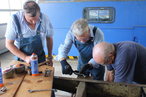 Es wurden Überlegungen über die weitere Bearbeitung, die Reinigung des Fahrzeuges und welche Teile erneuert werden müssen, angestellt. Als nächstes müssen Kostenvoranschläge für die Reifen, Farbe/Lacke etc. eingeholt werden.