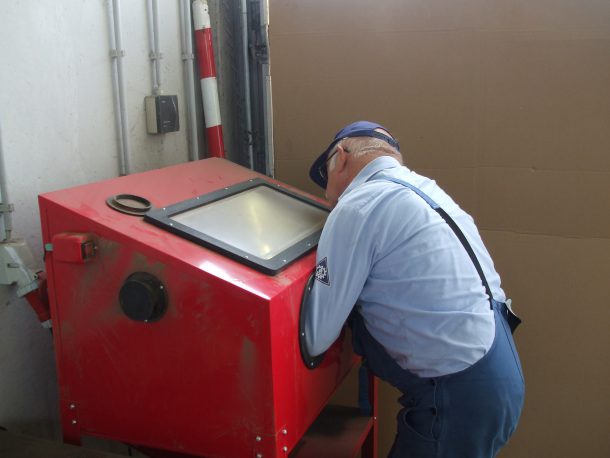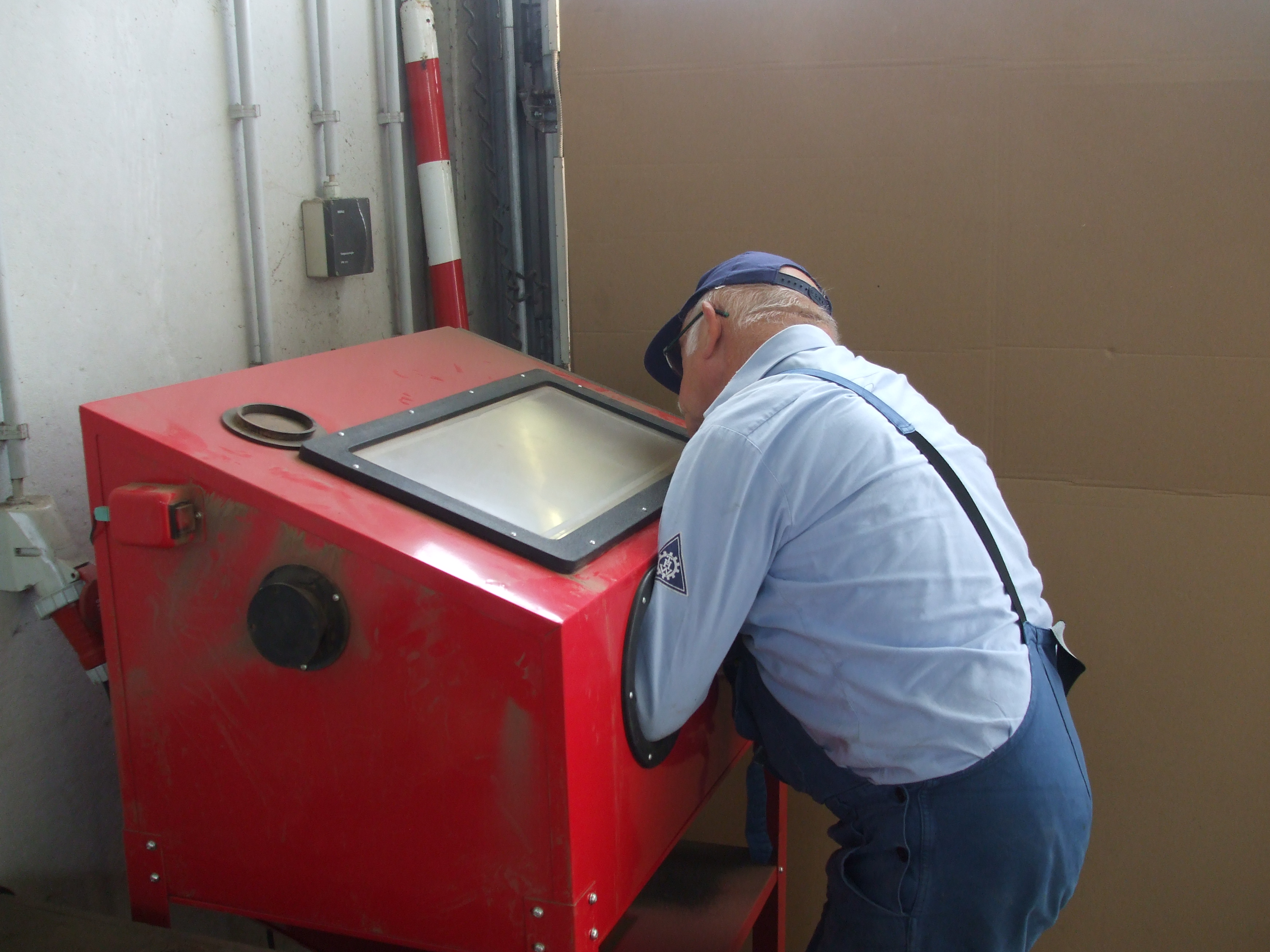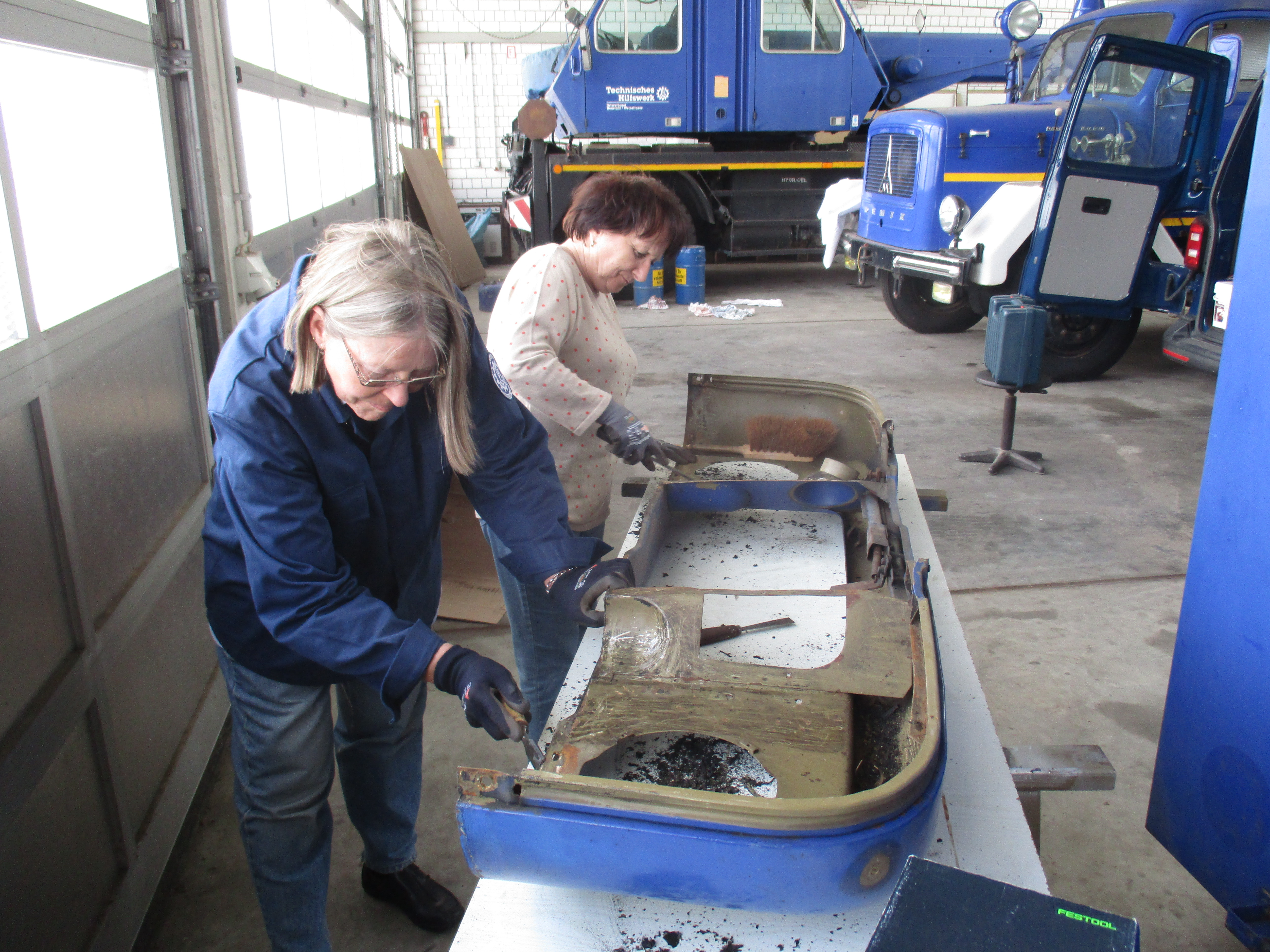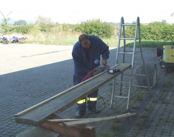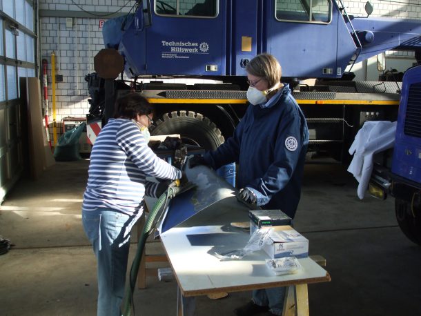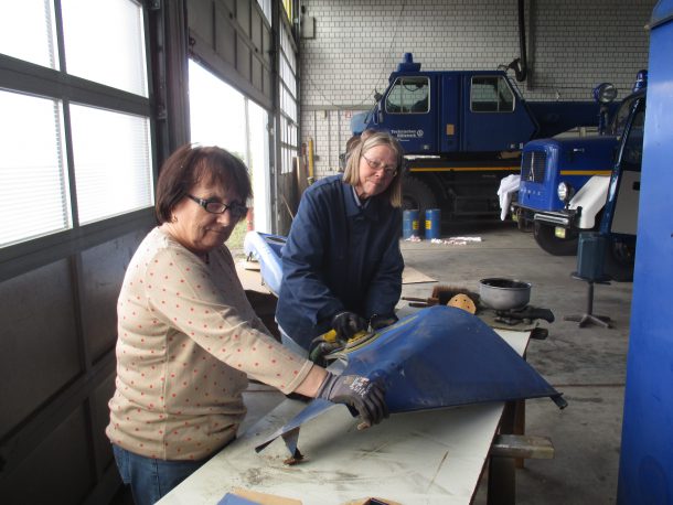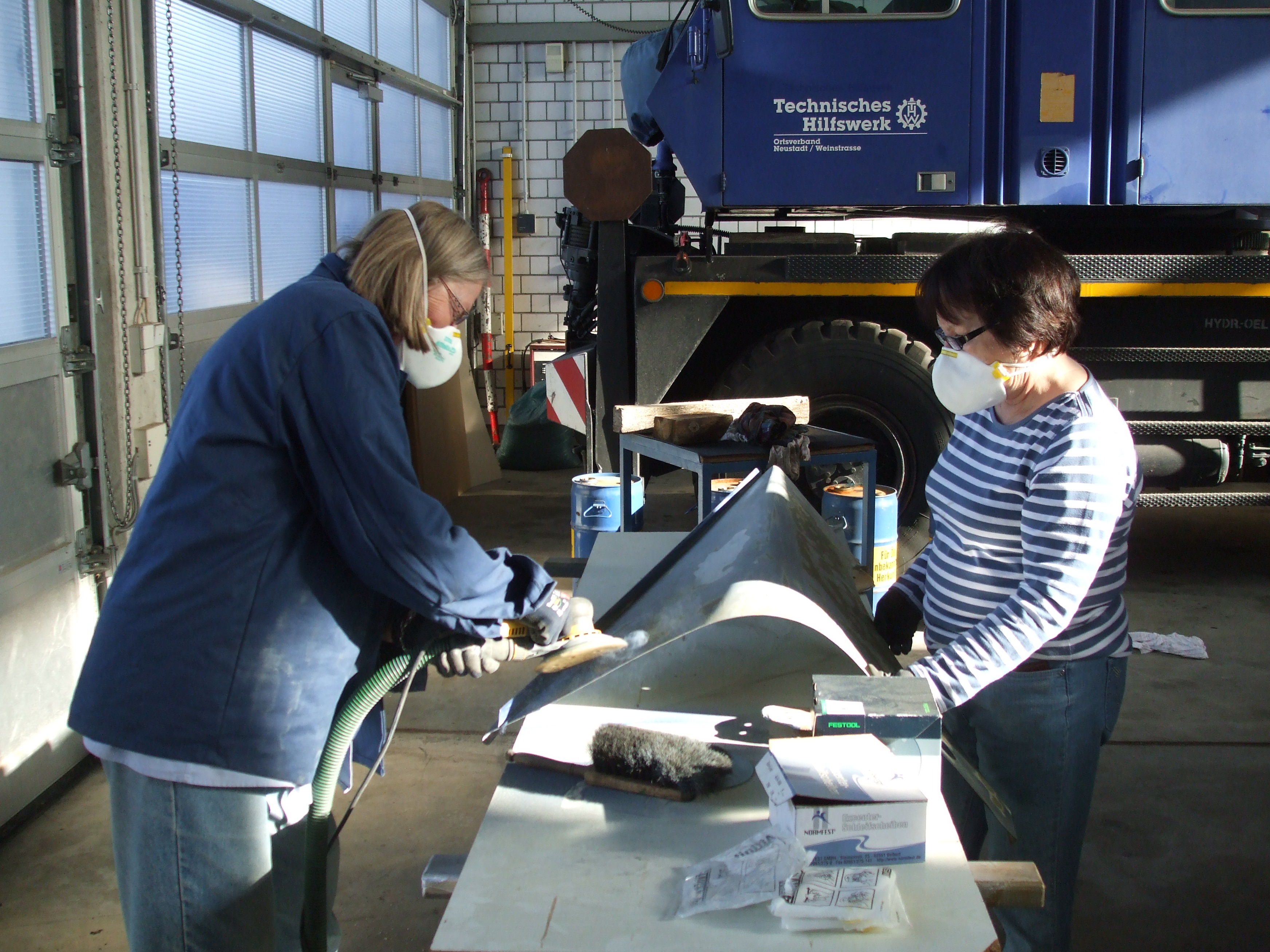 Anschließend wurde der alte Lack mit der Schleifmaschine abgeschliffen. Bei dieser Arbeit musste zeitweise auch Mundschutz getragen werden.