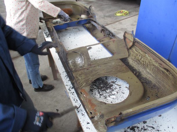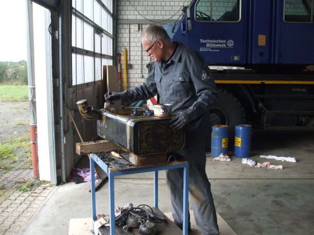 Von den Kotflügeln wurde der Teer (Unterbodenschutz) mit Spachteln weggekratzt, was nicht so einfach war.