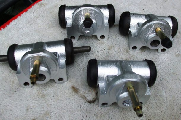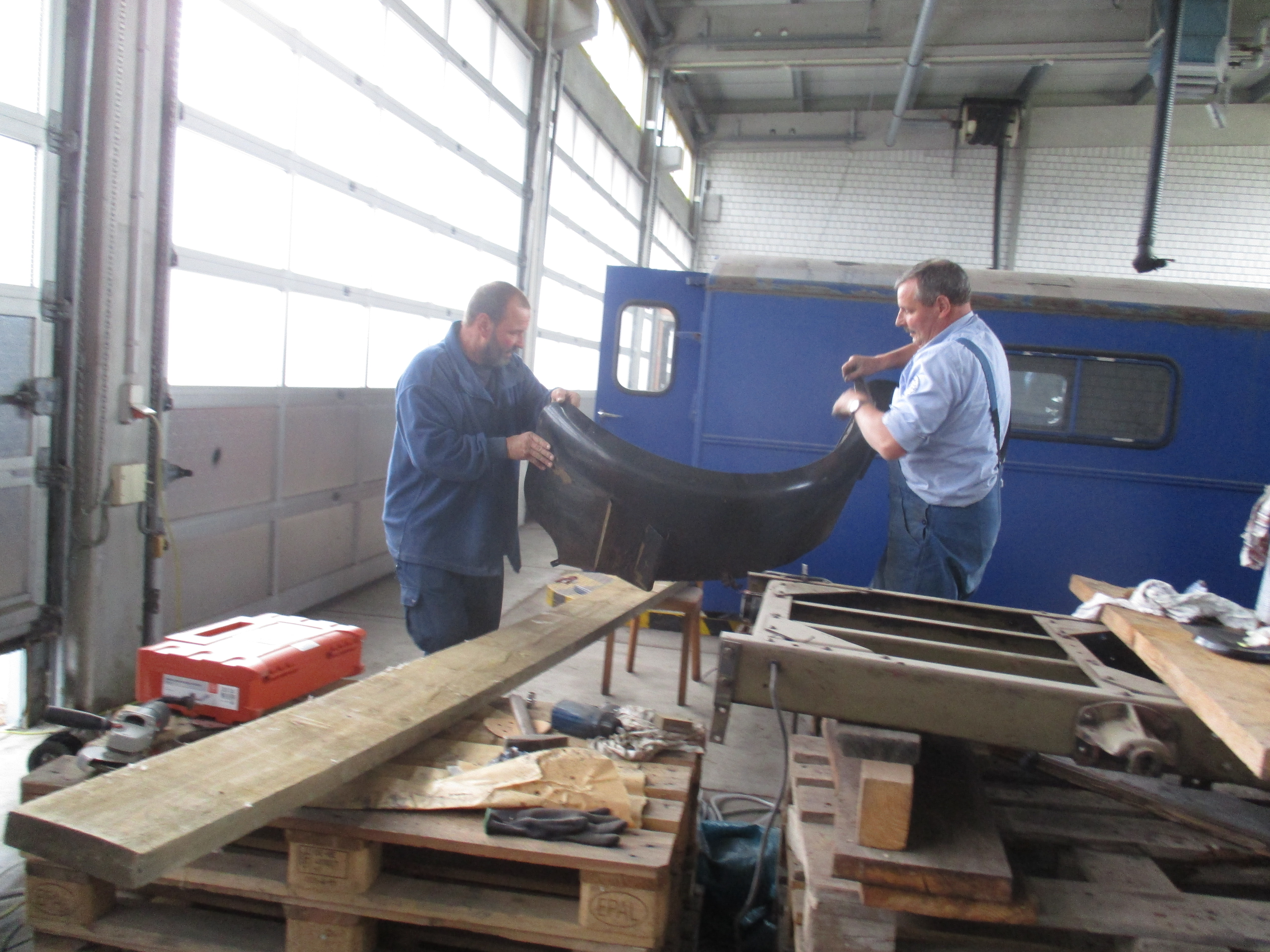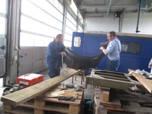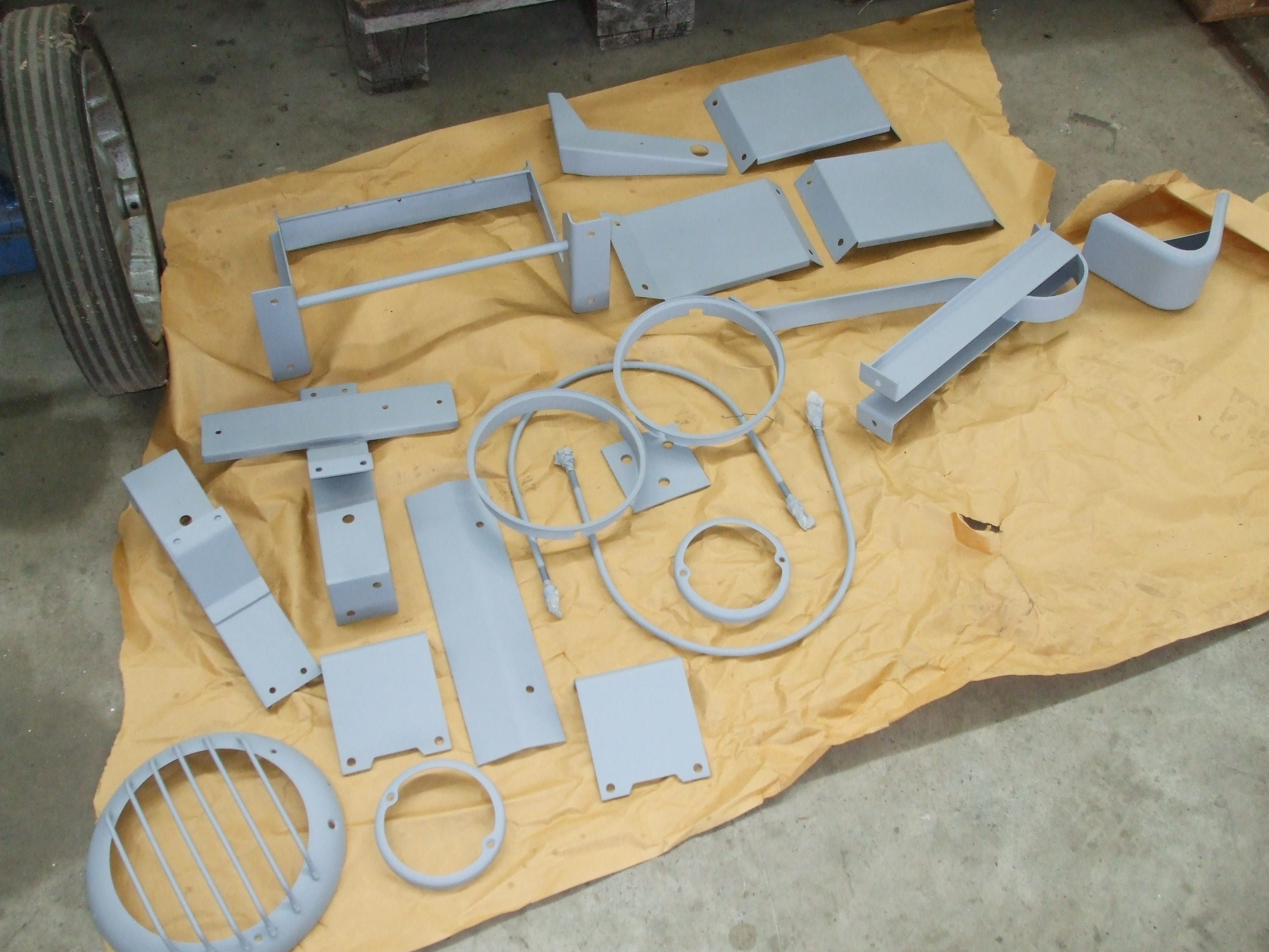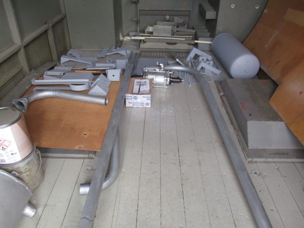 Zum Schluss des Arbeitstreffens wurden die grundierten Kleinteile und die ebenfalls bereits grundierten Kotflügel im Kofferaufbau des Hanomag ausgelegt.