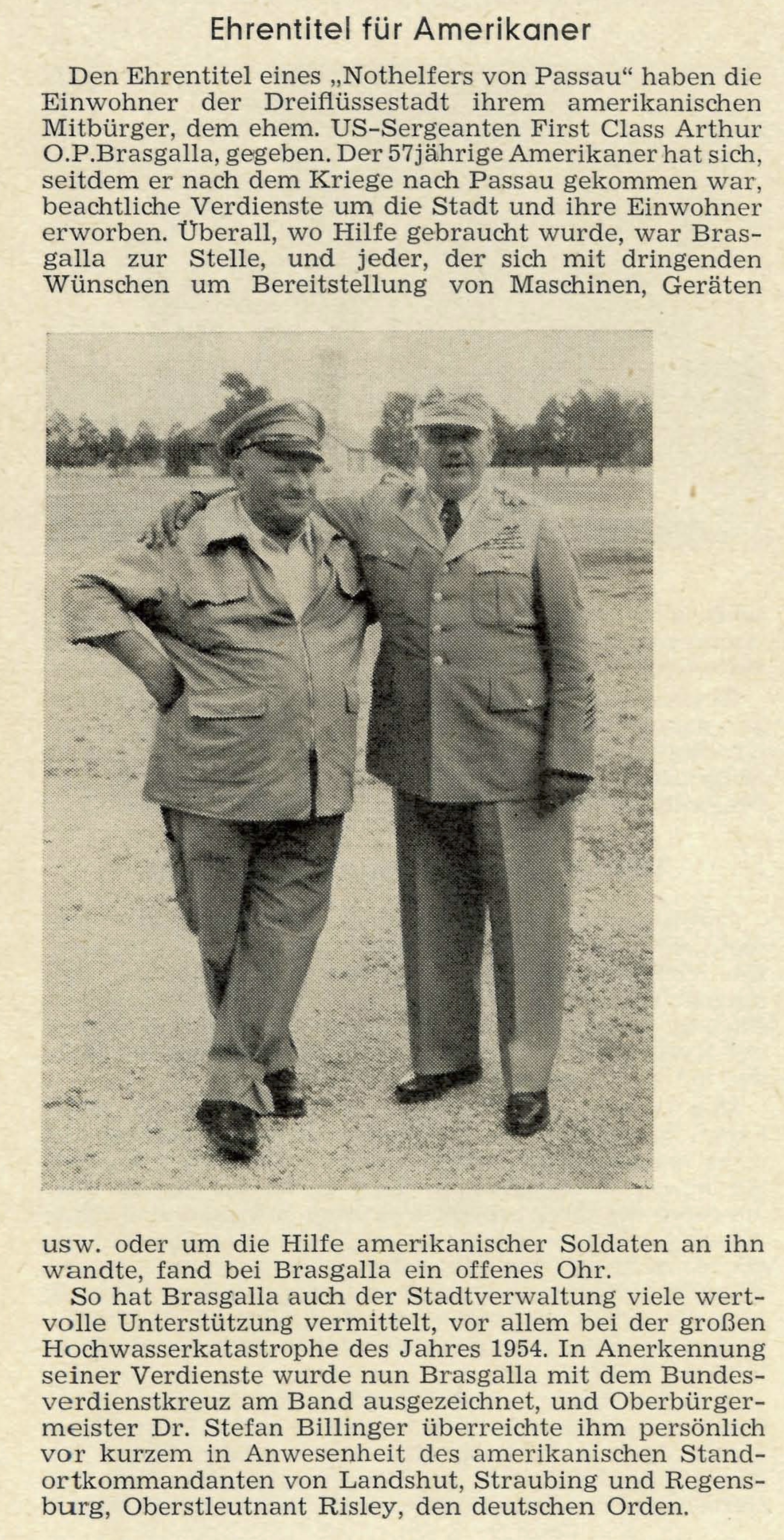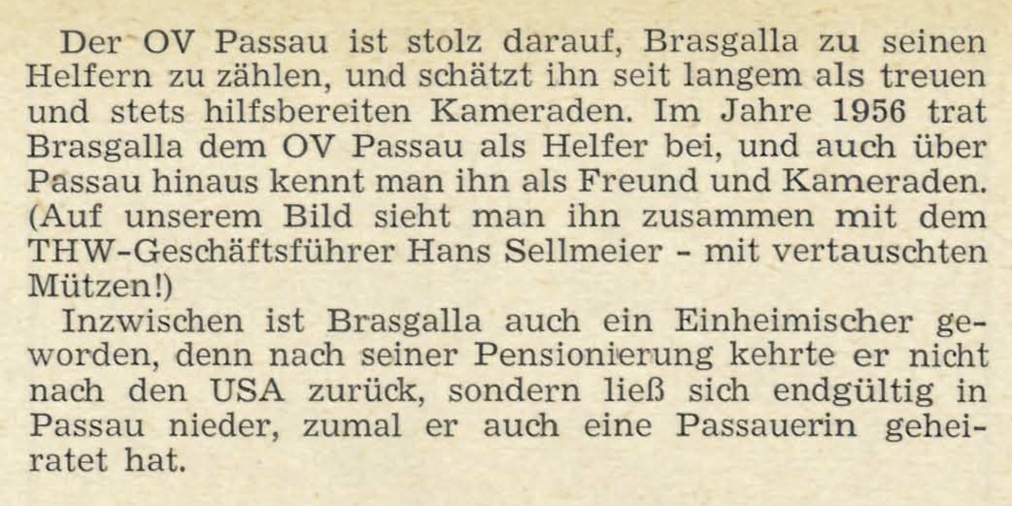Im Jahr 1956 tritt US Sergeant First Class Arthur O. P. Brasgalla als erster „Ausländer“ dem Technischen Hilfswerk bei, er wird Helfer des THW-Ortsverbandes Passau.