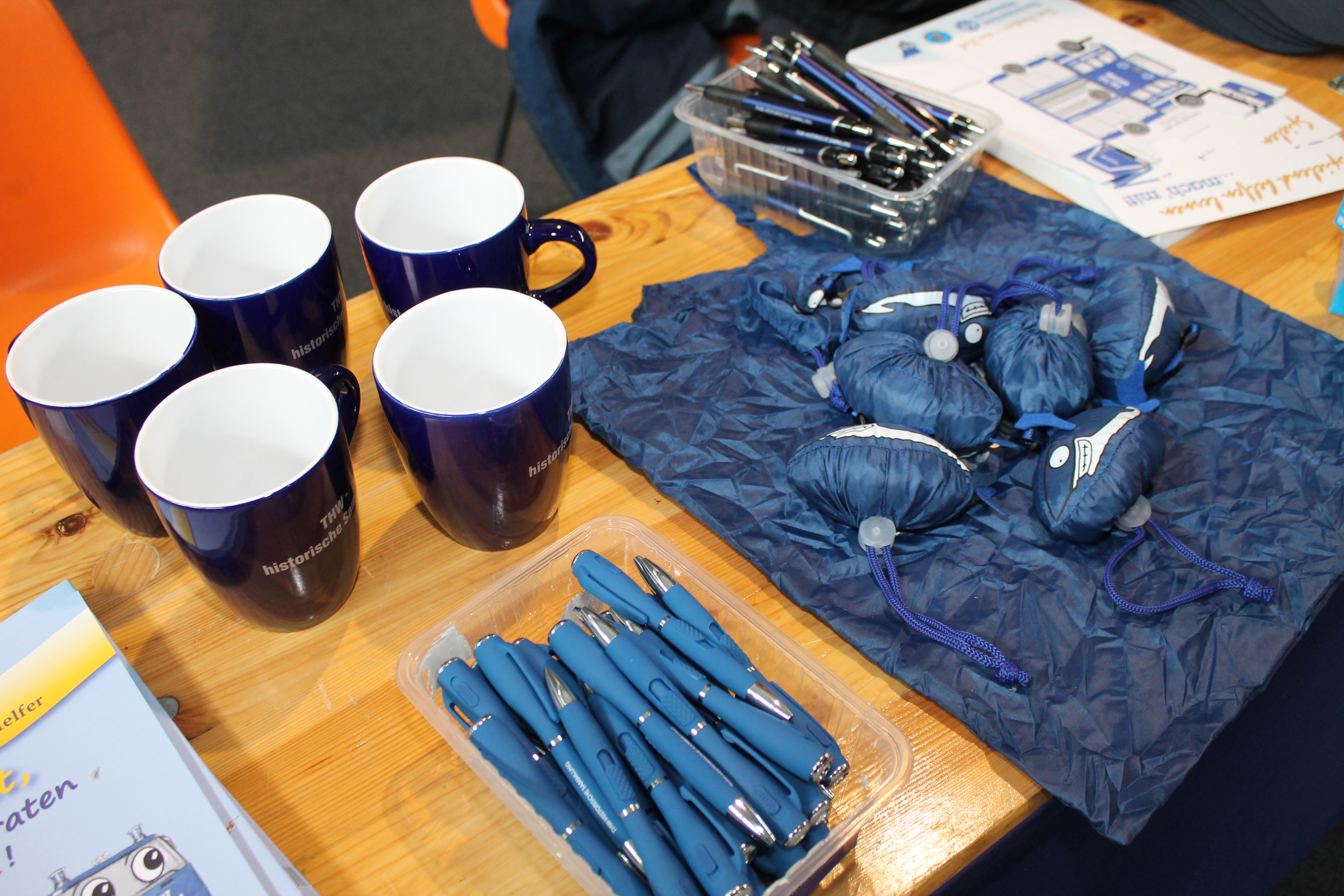 Natürlich wurde auch ein Tisch für das Werbematerial (THW-Fähnchen, Tassen mit Aufschrift THWhS, Malbücher, Bastelbögen) aufgebaut. Ausgelegt wurden neben dem Werbematerial auch die THWhS-Broschüre 20 Jahre THWhS, der Jahresbericht 2017 und THWhS- und Förderverein-Flyer.