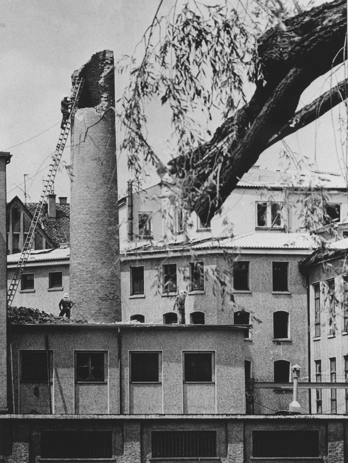Gefährliche Arbeiten in luftiger Höhe: Sicherung eines zerstörten Kamins (Fotograf: Kretschmer)