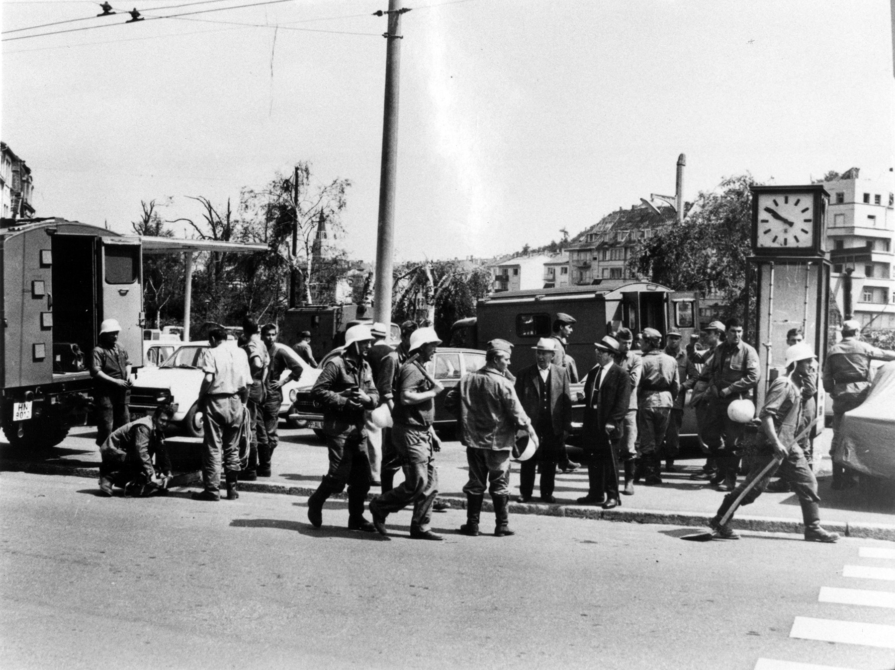 In der Bleichstraße in Pforzheim geht eine Gruppe des THW in den Einsatz. Um 21.50 Uhr am Abend des 10. Juli 1968 ist die Uhr stehengeblieben (Fotograf: Bischoff)