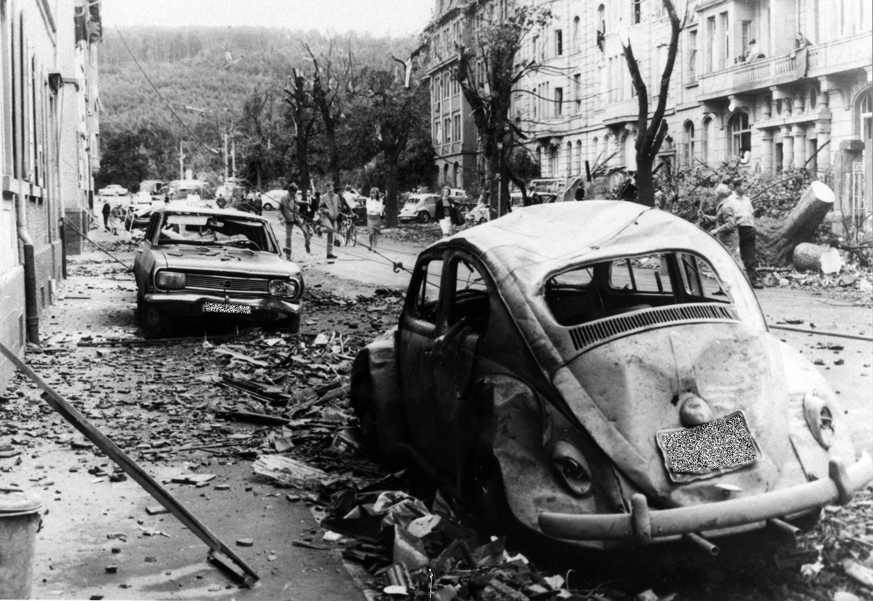 Der Wirbelsturm, der zuerst über die französischen Vogesen im Westen und danach über die heutigen Landkreise Karlsruhe, den Enzkreis und den Süden der Stadt Pforzheim hinweg zog, schlug in der Region Nordschwarzwald eine 35 Kilometer lange und bis zu 500 Meter breite Schneise der Verwüstung. In der Gemeinde Ottenhausen starb ein Ehepaar durch den Wirbelsturm. In der Stadt Pforzheim wurden 200 Menschen durch umherfliegende Trümmerteile zum Teil schwer verletzt. 140 Menschen hatten buchstäblich kein Dach mehr über dem Kopf. Autos wurden vom Sturm wie Spielzeug durch die Luft gewirbelt, Hochspannungsmasten einfach abgeknickt. Über 2000 Häuser wurden durch Druck- und Sogwirkung beschädigt, ganze Dächer komplett abgedeckt, die Ziegel vollständig herunter geweht und Tausende von Bäumen einfach entwurzelt. Sechs Gittermasten einer 110 kV-Freileitung der Stromversorgung knickte der Tornado einfach um. Das gesamte Ausmaß der gewaltigen Schäden konnten die Verantwortlichen erst am nächsten Morgen bei Tageslicht erkennen. Dann lief die Maschinerie der Hilfe an. Einsatzkräfte von Feuerwehr, Deutschem Roten Kreuz, Technischem Hilfswerk, den französischen und den amerikanischen Streitkräften kamen 14 Tage lang bei Sicherungs- und Aufräumarbeiten zum Einsatz. Unterstützung schickte auch die Bundeswehr, die aus nahe gelegenen Standorten handwerklich ausgebildete Soldaten, überwiegend Zimmerleute und Dachdecker, ins Katastrophengebiet schickte. Zahlreiche Vereine und private Initiativen halfen mit, die Schäden zu beseitigen. Der damalige Bundeskanzler Kurt Georg Kiesinger, sein Außenminister Willy Brandt und der baden-württembergische Ministerpräsident Hans Filbinger machten sich vor Ort ein Bild von den verheerenden Schäden. Starke Polizeikräfte mussten eingesetzt werden, um Katastrophentouristen, die mit organisierten Busreisen nach Pforzheim kommen wollten, an den Stadtgrenzen abzuweisen.